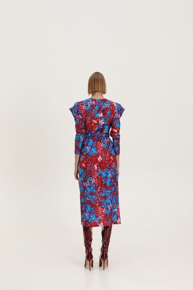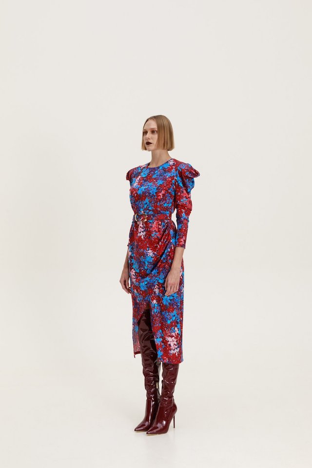Midi dress with long puff sleeves and padding. It has an opening in the front and a zipper in the back.