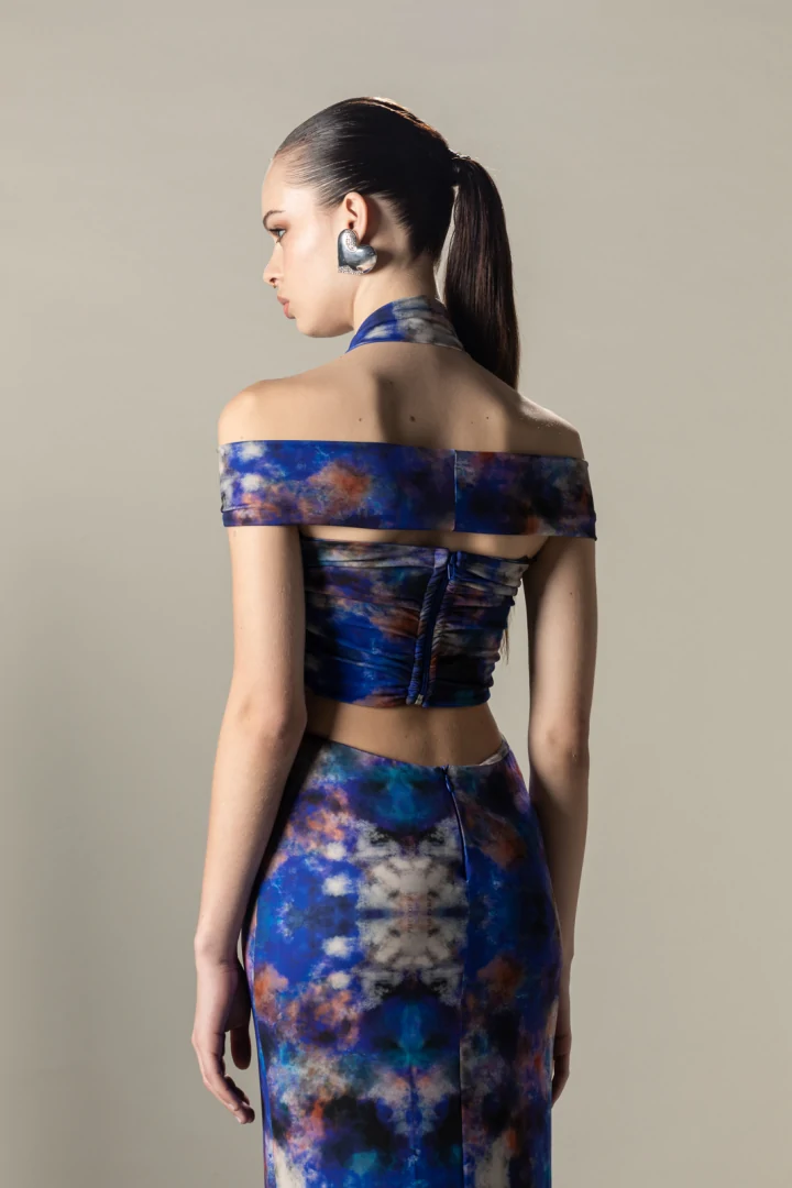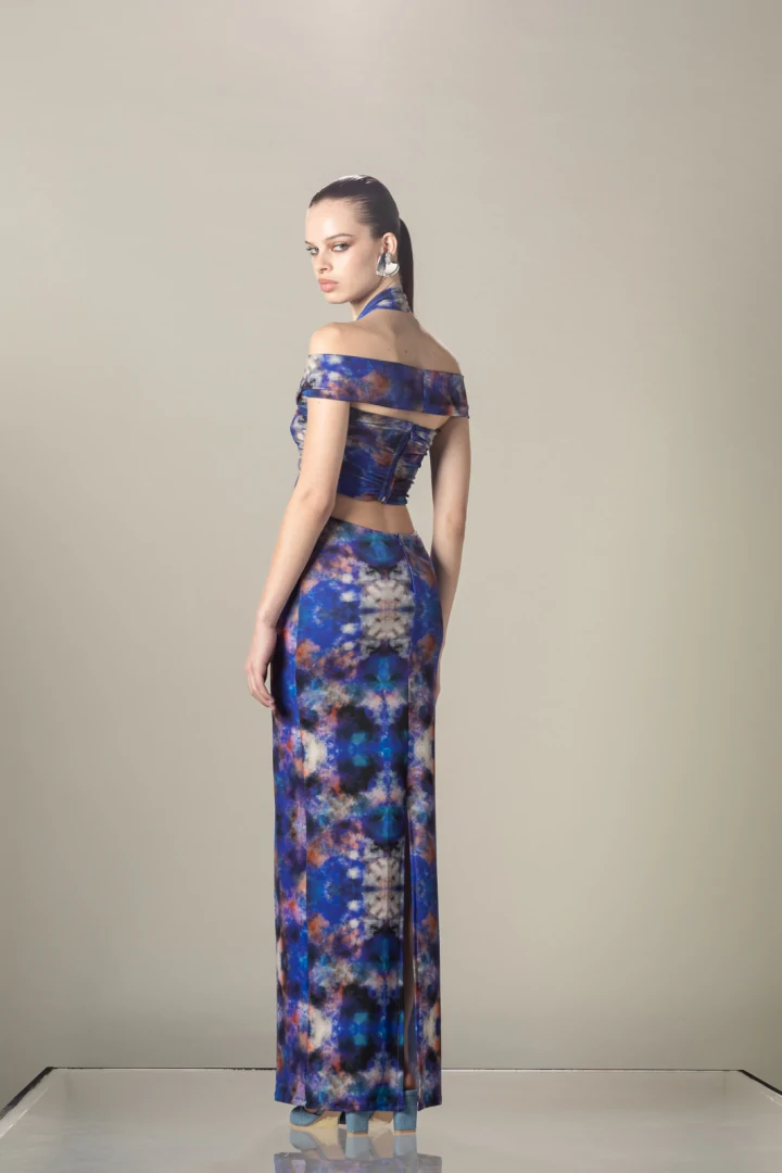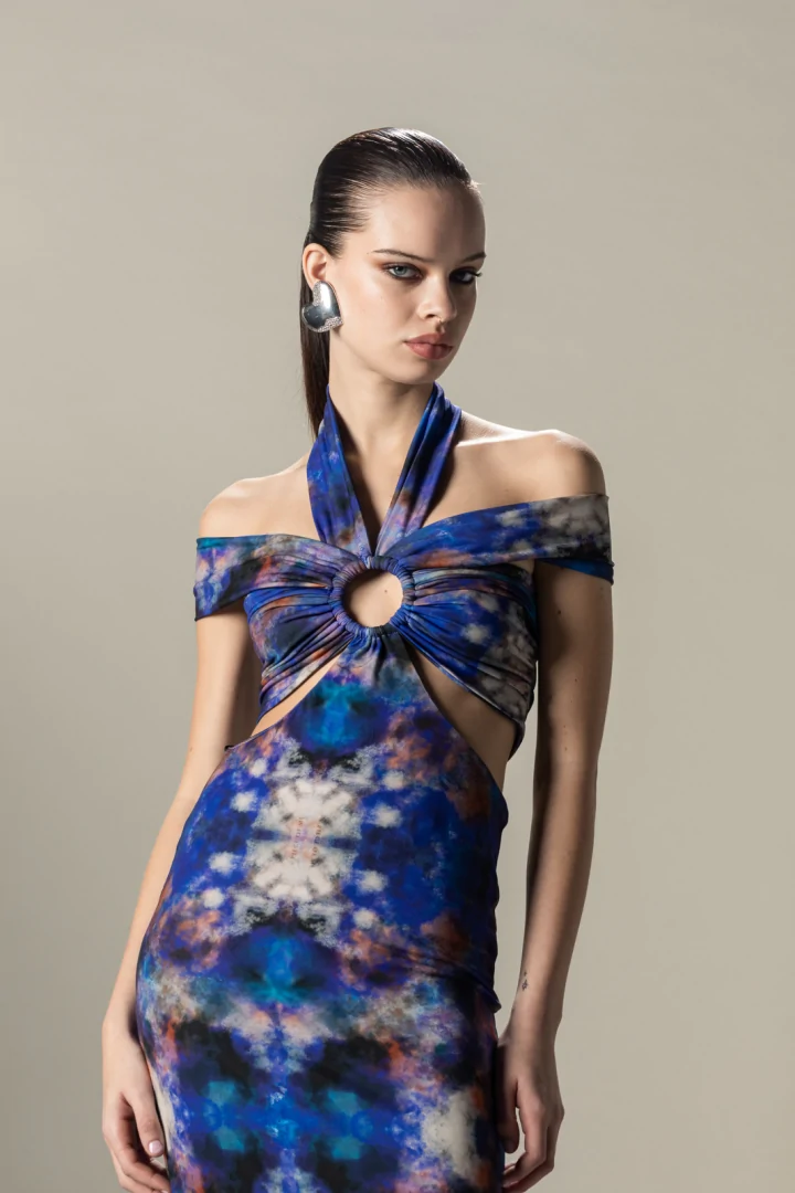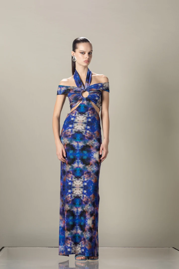 Φόρεμα maxi σε στενή γραμμή απο ελαστικό ζέρσευ ύφασμα με άνοιγμα στην μέση, έξω τους ώμους και έναν κρίκο μπροστά που δημιουργεί σχήμα λουλουδιού. Κλέινε με δύο ξεχωριστά φερμουάρ πίσω.