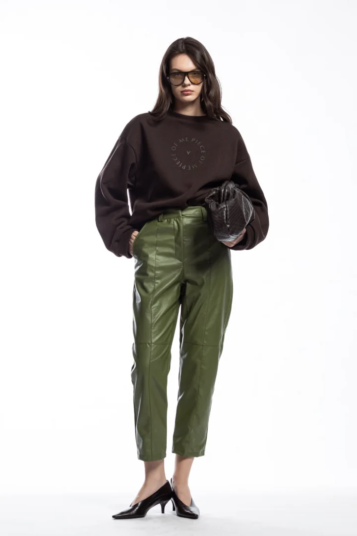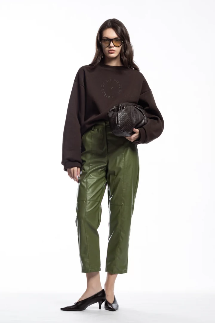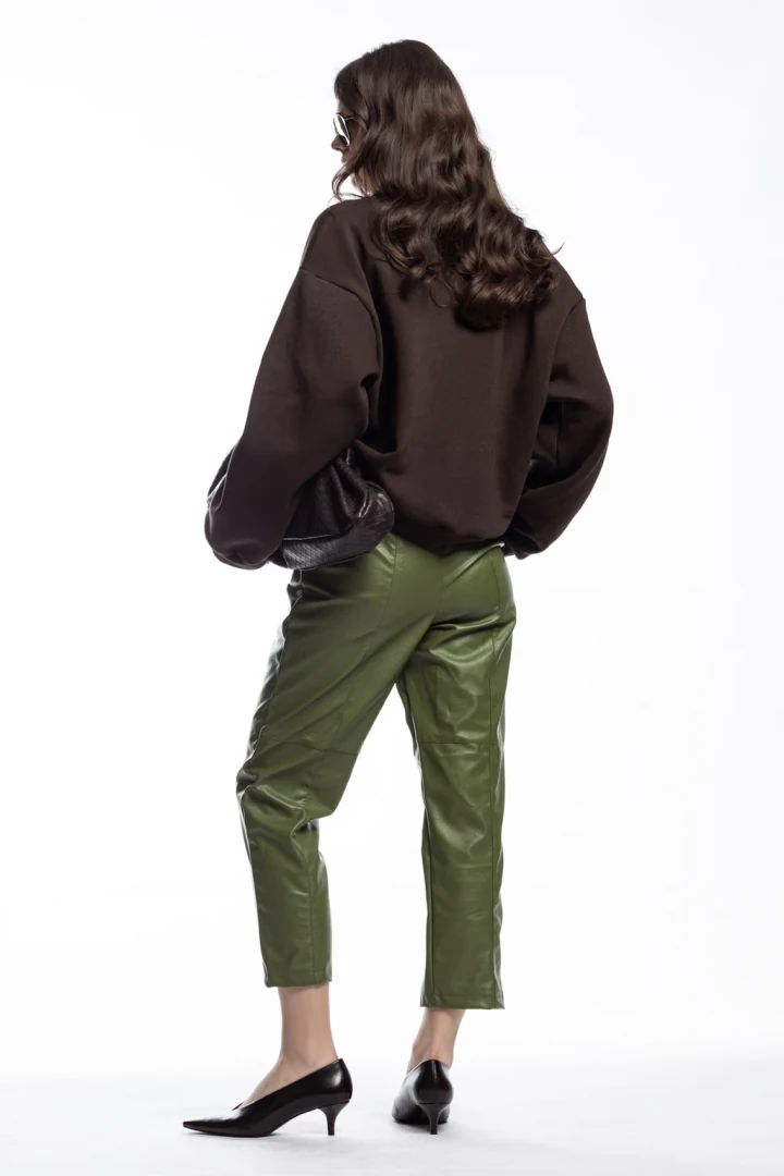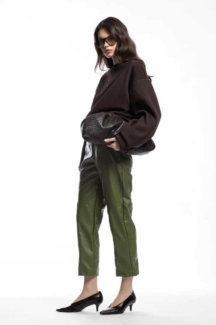 Παντελόνι ψηλόμεσο δερματίνη σε ίσια γραμμή μέχρι τον αστράγαλο. Διαθέτει τσέπες μπροστά και πίσω φιλέτο. Κουμπώνει με φερμουάρ.