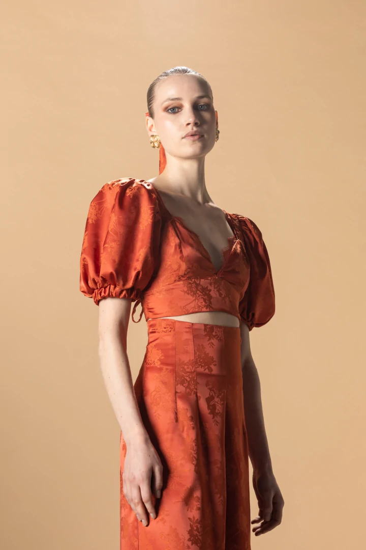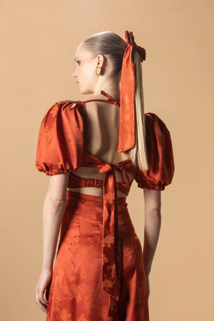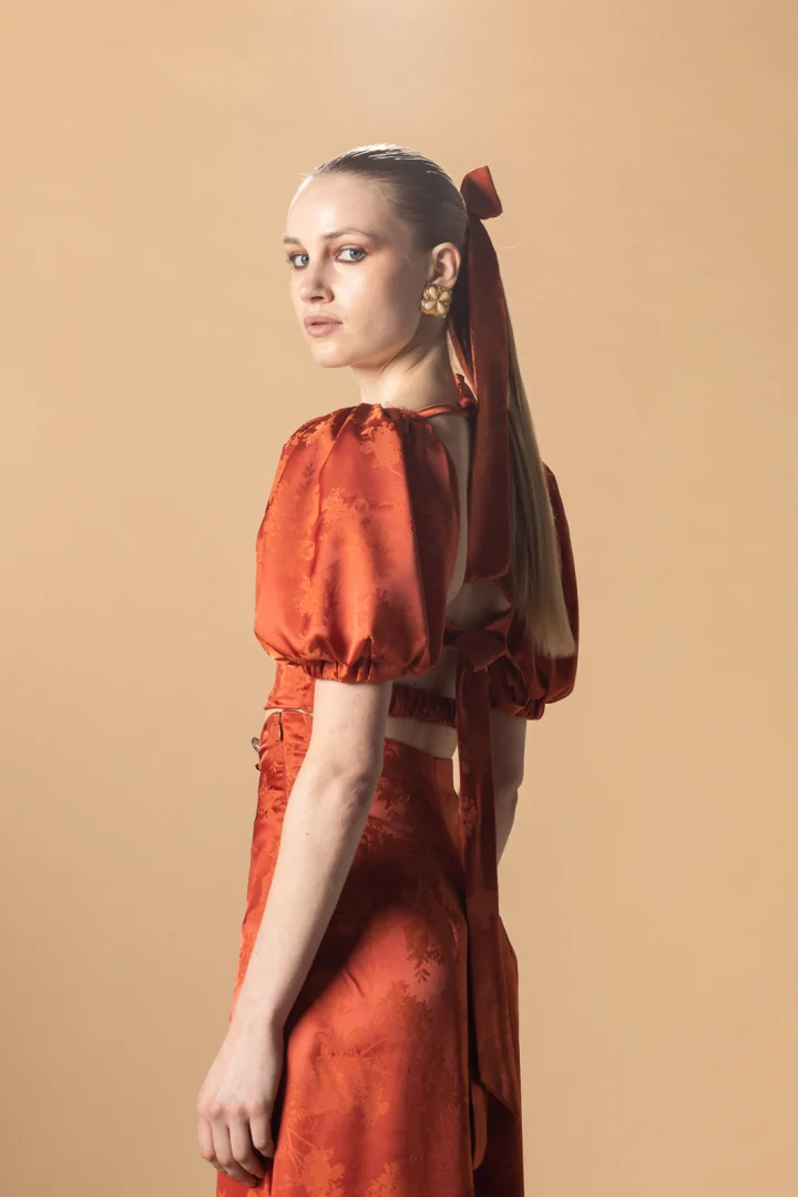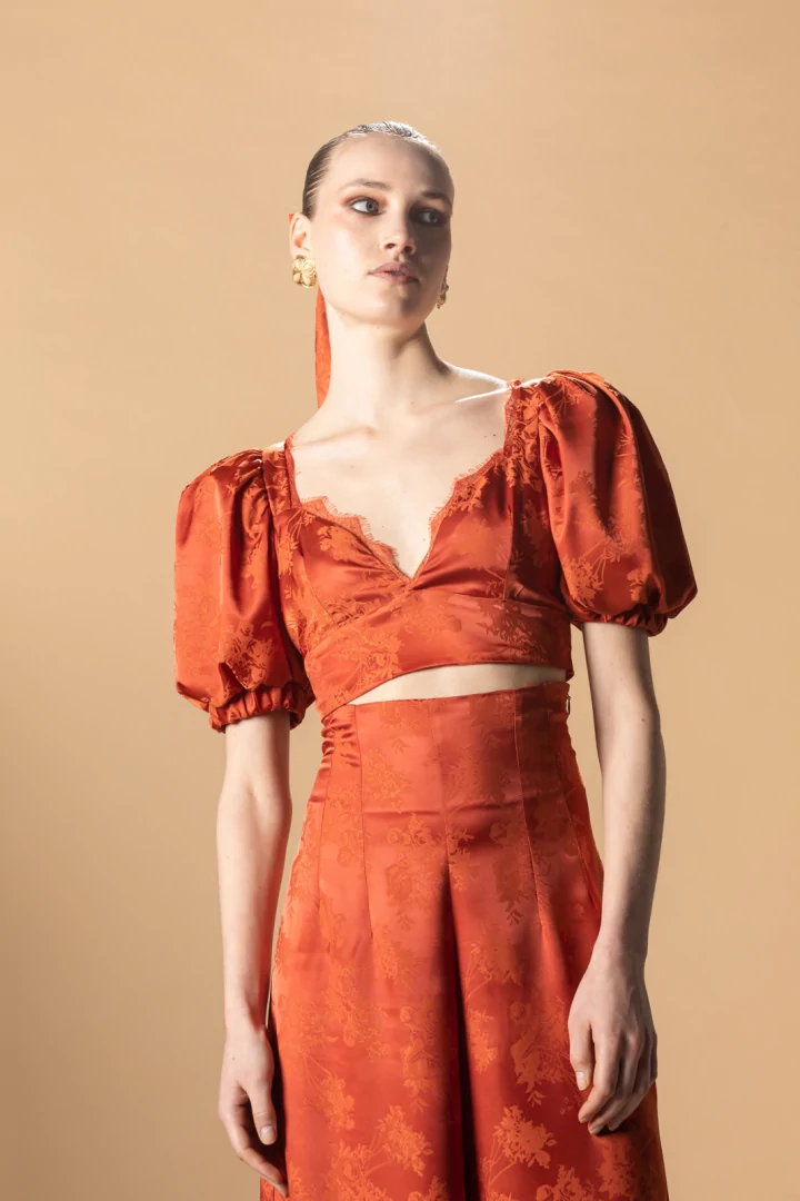 Crop top εφαρμοστό με κοντά puff μανίκια, δαντέλα μπροστά και κορδόνια που δένουν πίσω.