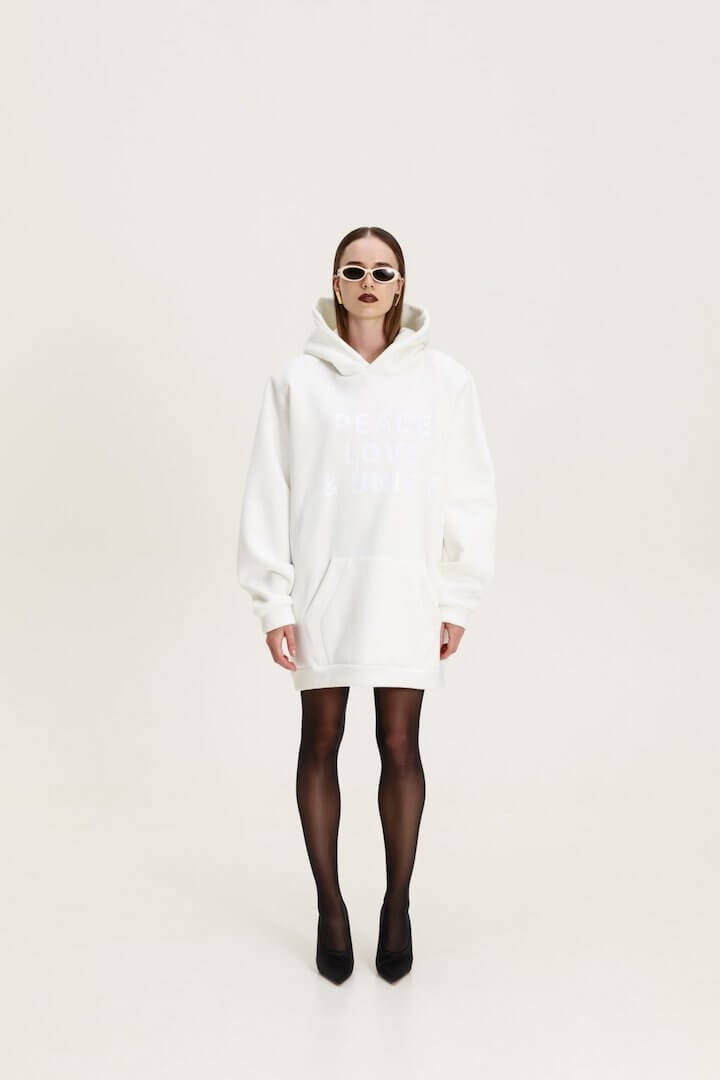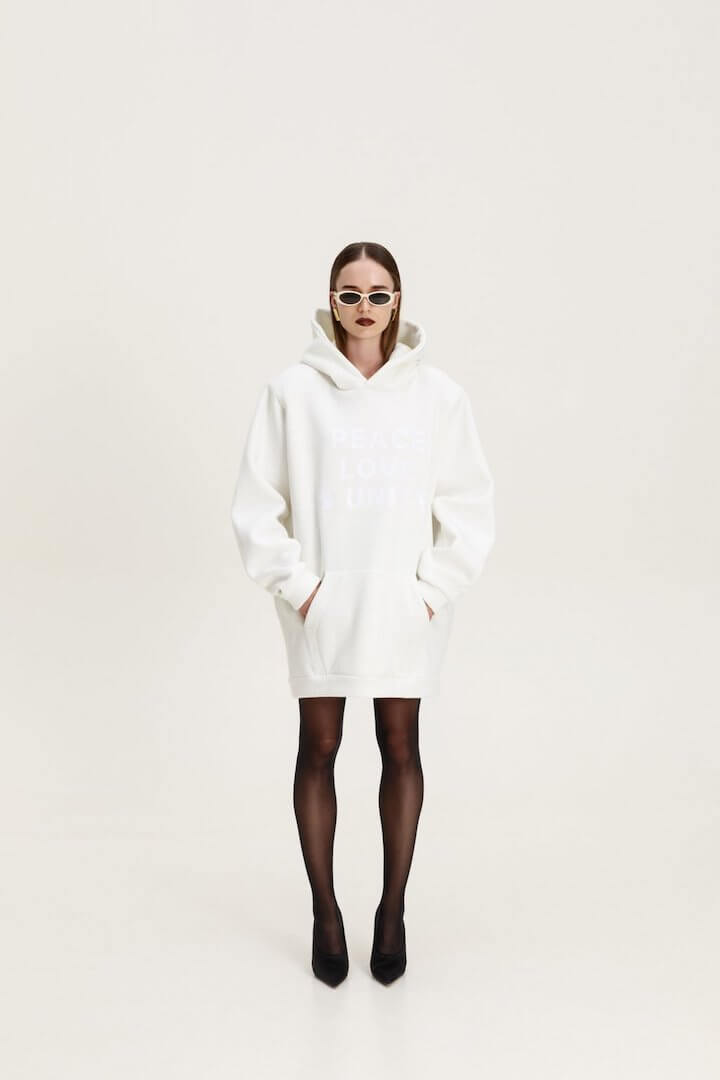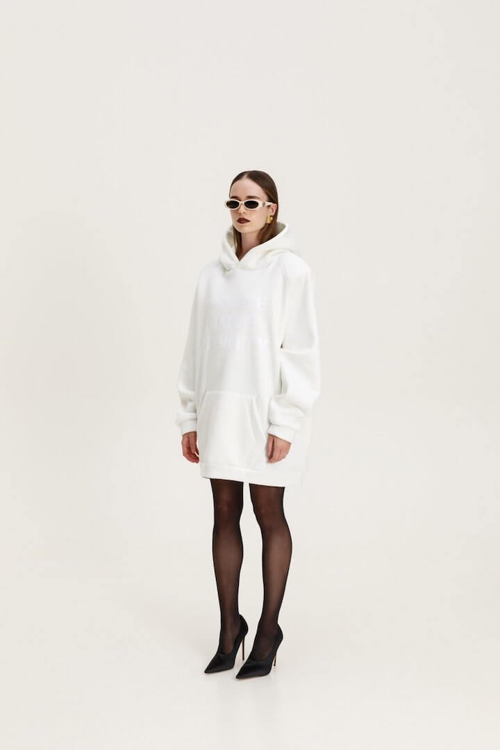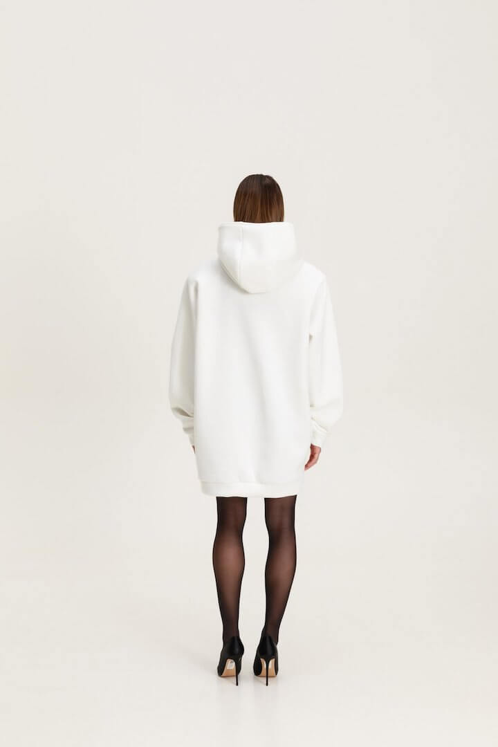 Oversized sweatshirt dress with hood and removable padding. The front has a print and a pocket.