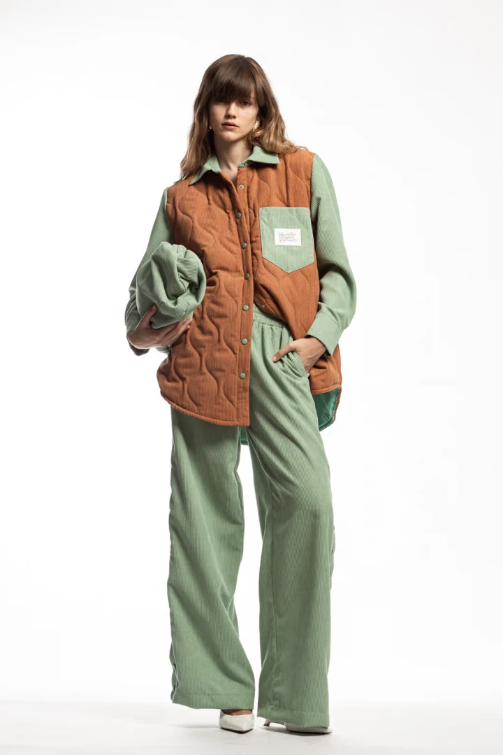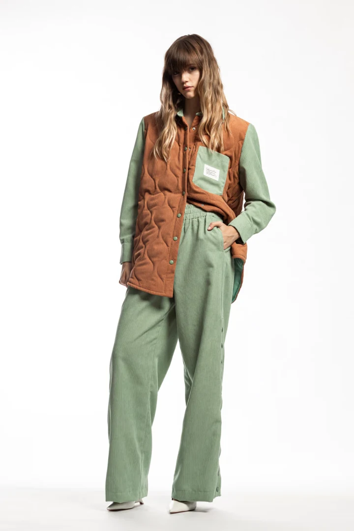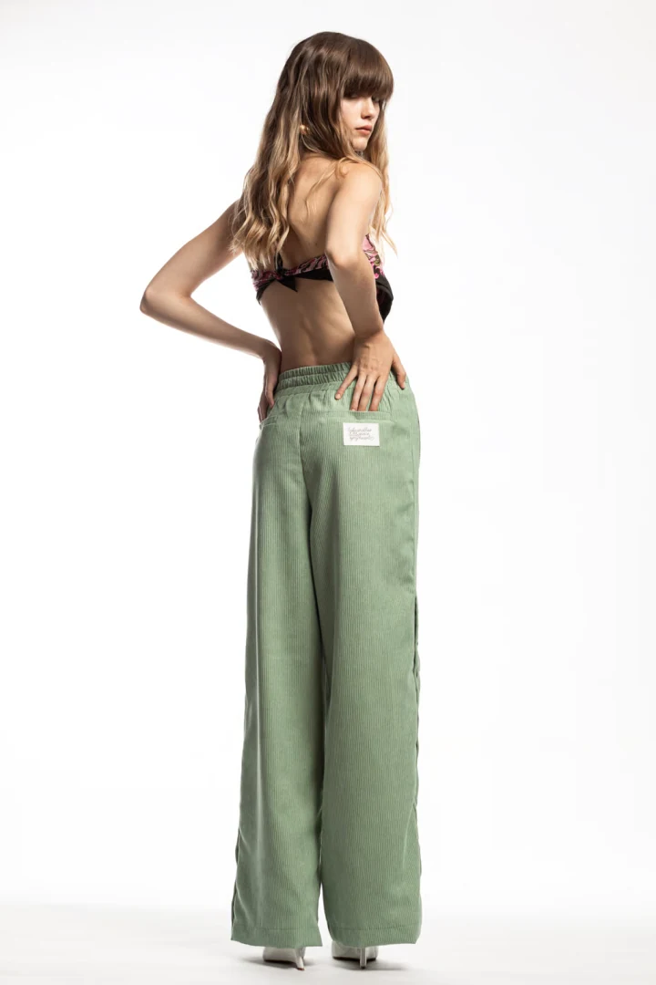 Παντελόνι ψηλόμεσο κοτλέ άνετο σε ίσια γραμμή. Διαθέτει λάστιχο στην μέση και κουμπιά/snaps στο πλάι δεξιά και αριστερά.
