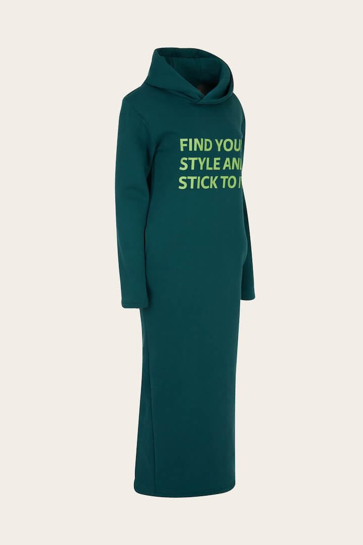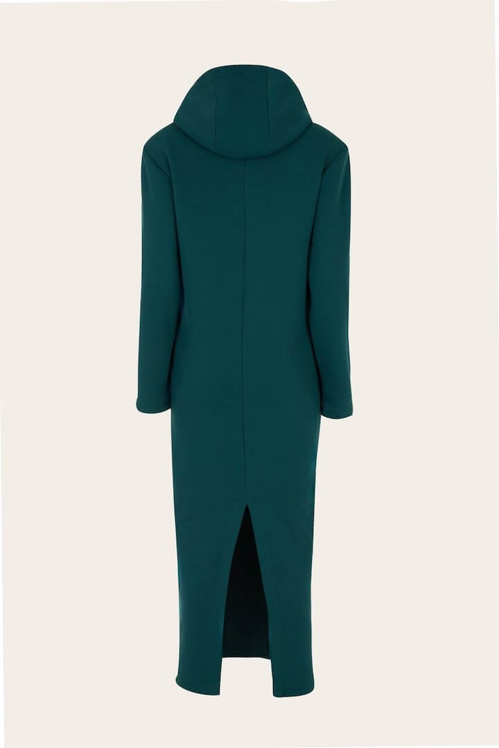 A-line hooded sweatshirt dress. It has sharp shoulders with removable padding and side pockets.
