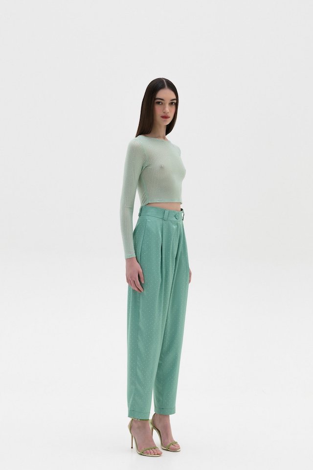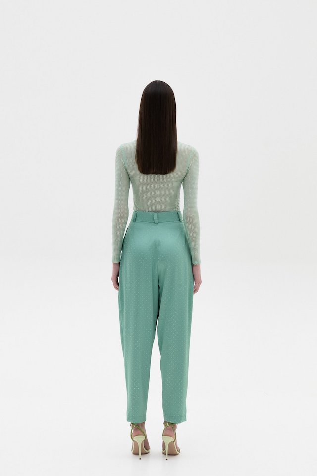 Carrot-line trouser in satin with pockets in the front, fastens with a button and zip.