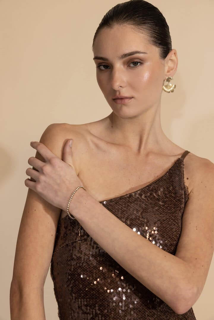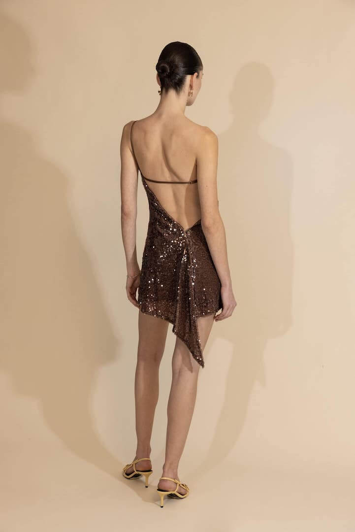 Dazzling and effortlessly glamorous, the Zendaya Dress is designed to make a statement at any elegant evening affair. Embellished with shimmering sequins on a tulle base in a soft brown hue, this stunning mini dress features an asymmetrical one-shoulder design. The open back detail, accented with a thin strap, enhances its sophisticated allure. Perfect for glamorous events and special occasions where you want to shine.