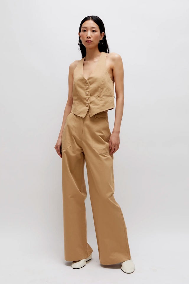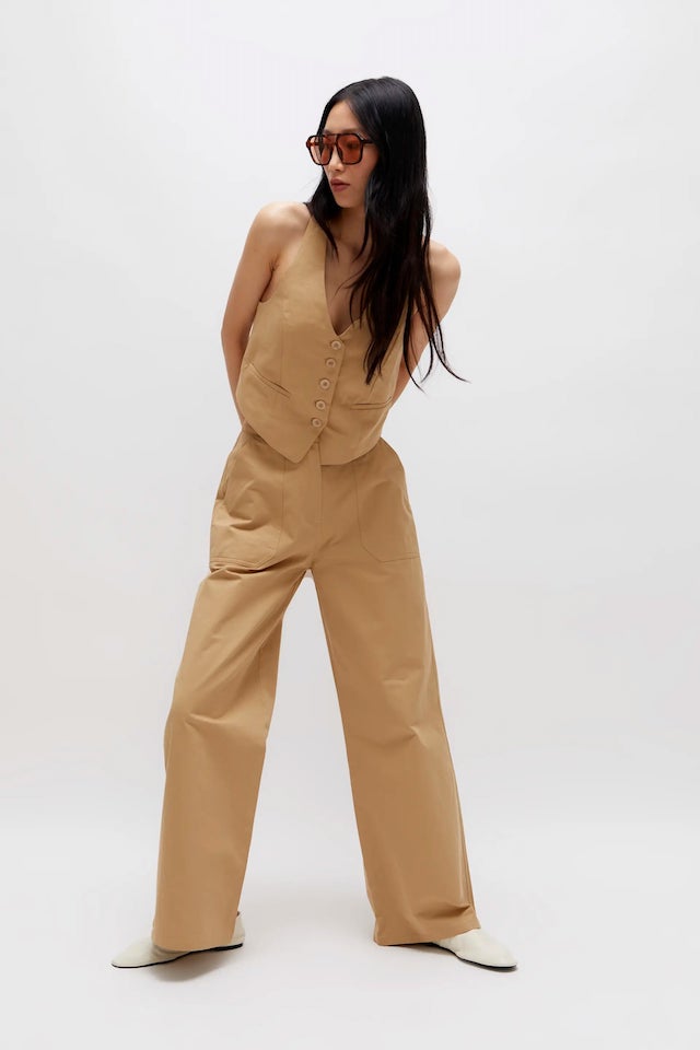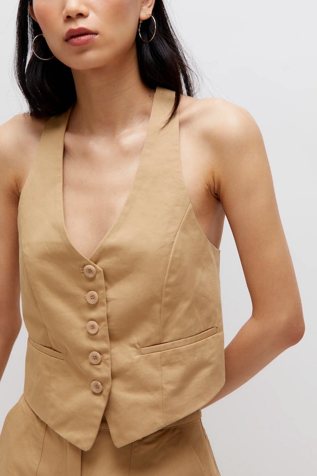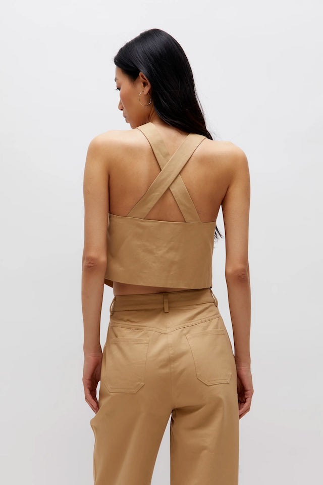 Short camel twill vest. With a V-neckline and crossed straps at the back. Front button closure. Front pockets. Inner lining. The model is 174 cm tall and wears size S.