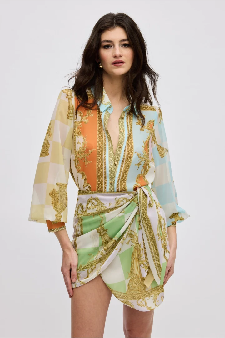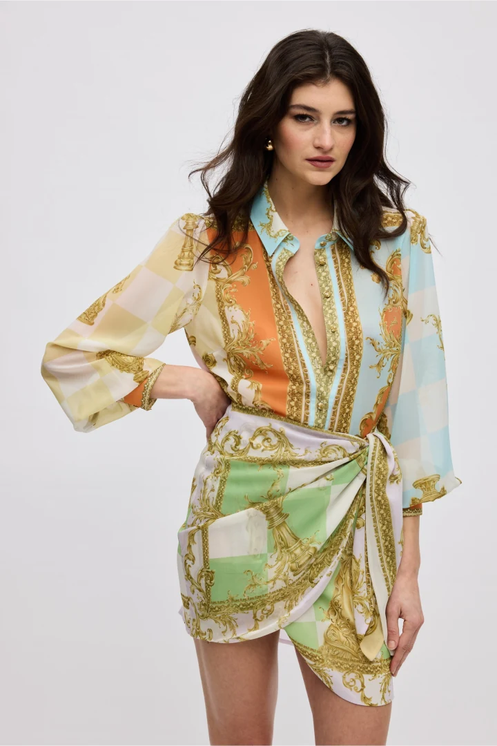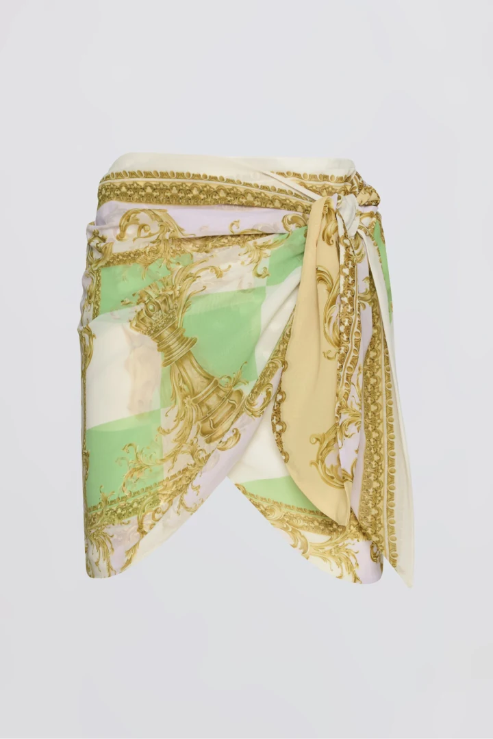 Αναδείξτε τη θηλυκότητά σας με τη Diana Skirt της Ciel Concept, μια γυναικεία mini φούστα που συνδυάζει τον σύγχρονο σχεδιασμό με την απόλυτη κομψότητα. Πρόκειται για μια εντυπωσιακή κρουαζέ (wrap) φούστα που δένει κομψά στη μέση, δημιουργώντας μια άκρως κολακευτική σιλουέτα που χαρίζει αέρινη κίνηση στο σώμα. Το σχέδιο απογειώνεται χάρη στο αποκλειστικό, ζωγραφισμένο στο χέρι μοτίβο (placement print) με περίτεχνα μπαρόκ στοιχεία, το οποίο δημιουργεί ένα απόλυτα ισορροπημένο και εντυπωσιακό οπτικό αποτέλεσμα. Ραμμένη από 100% ποιοτική βισκόζη, διαθέτει άνετη One Size εφαρμογή που καλύπτει άψογα μεγέθη από Small έως Large, ενώ το ύφασμά της ξεχωρίζει για την υψηλή αντοχή του στο τσαλάκωμα. Μια statement δημιουργία, περήφανα κατασκευασμένη στην Ελλάδα σε περιορισμένα κομμάτια. Συνδυάστε τη ιδανικά με το ασορτί Diana Shirt για ένα ακαταμάχητο ολοκληρωμένο look.