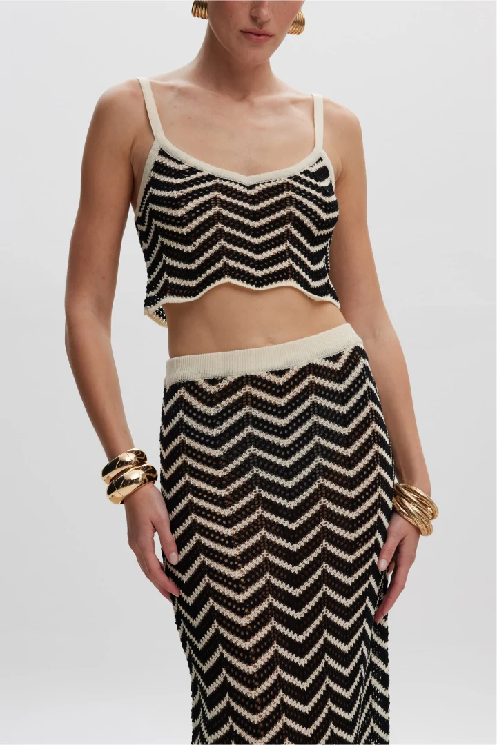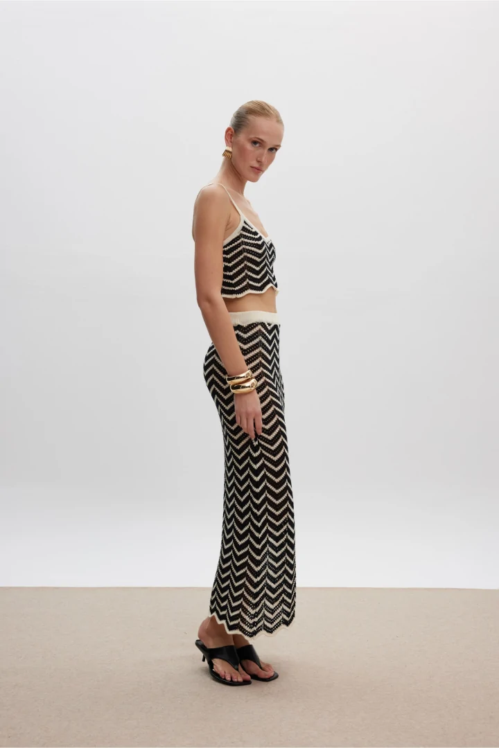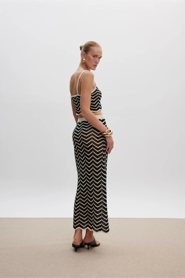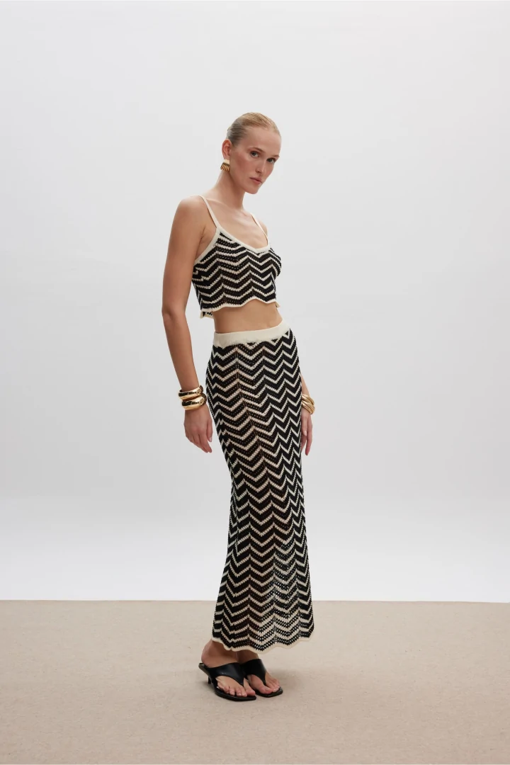 Πλεκτό σετ σε μαύρο και εκρού με ζιγκ-ζαγκ μοτίβο. Περιλαμβάνει cropped top με λεπτές τιράντες και μακριά ψηλόμεση φούστα σε ίσια γραμμή. Το πλεκτό ύφασμα και η γραμμή που αγκαλιάζει το σώμα προσφέρουν κομψότητα και καλοκαιρινή άνεση.