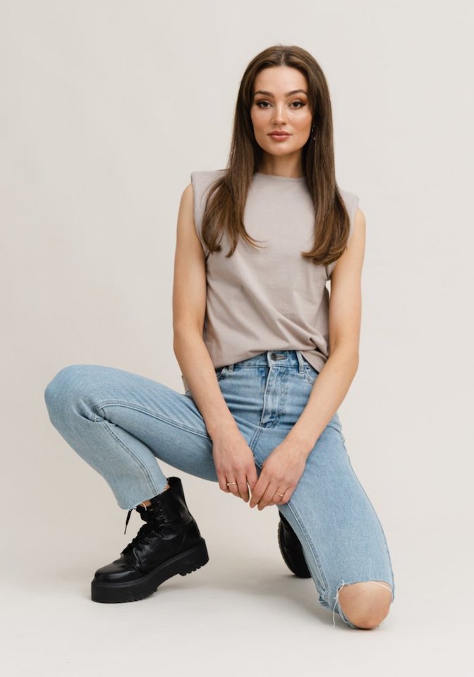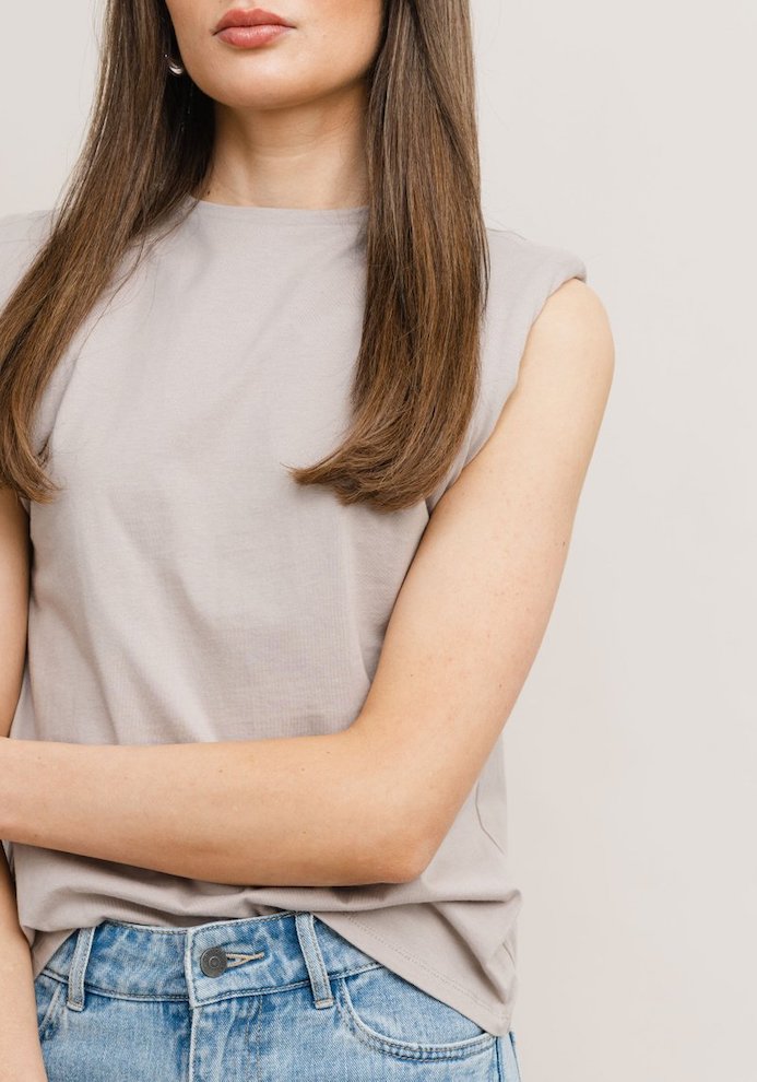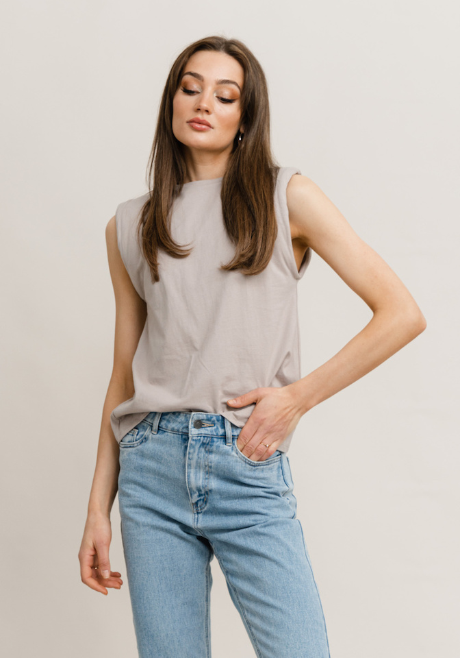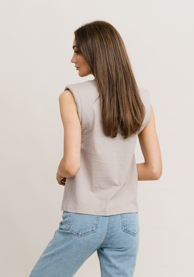 MUSHROOM. Sleeveless top with padding on shoulders. This top has a high neckline and a straight fitting to your body.