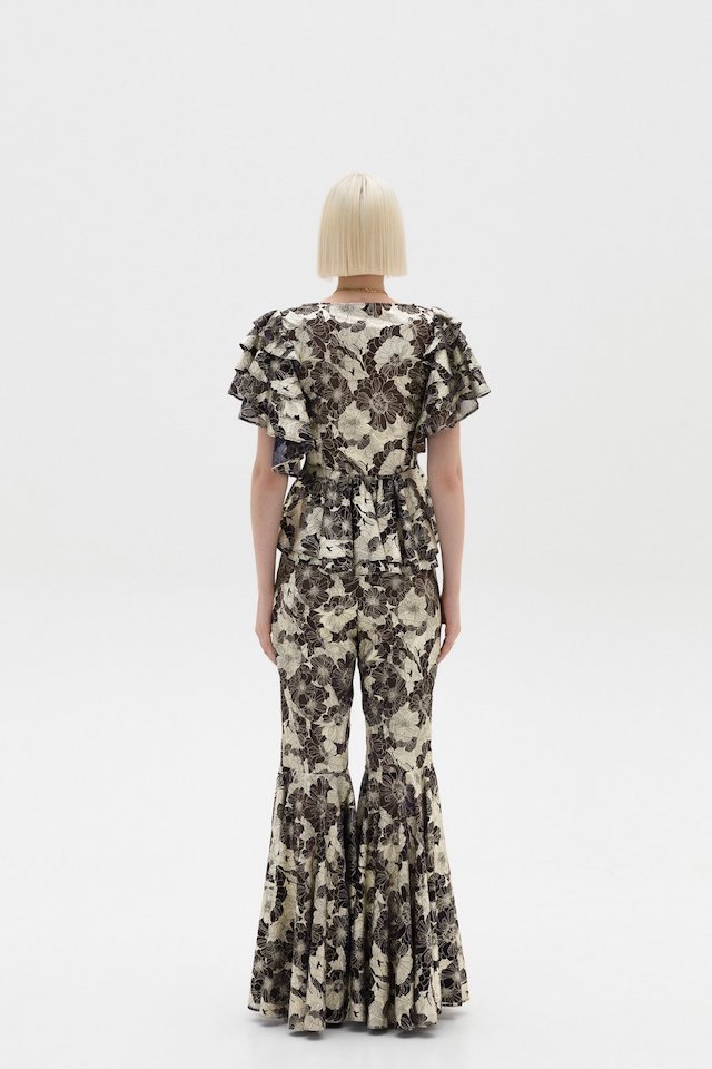 Short-sleeved blouse with ruffles on the sleeves, heart-shaped buttons and ruffles on the back.