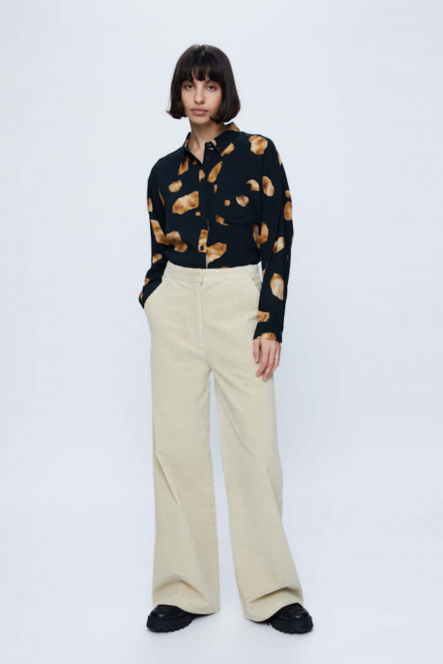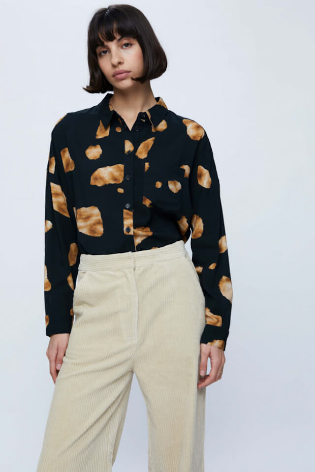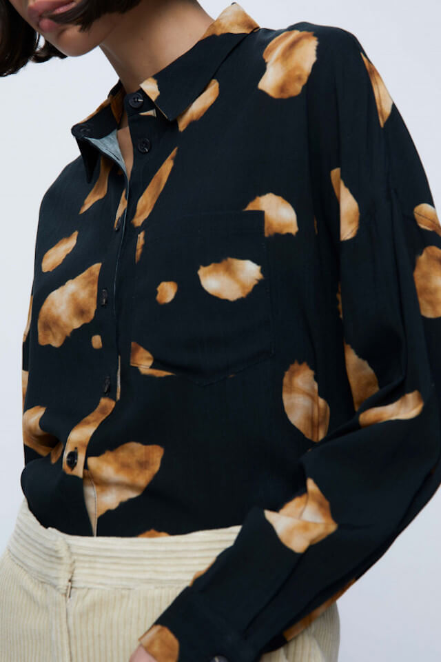 Flowy shirt with geometric print. With a lapel collar and long sleeves ending in buttoned cuffs. Front button closure. Front pocket. The model is 175 cm tall and wears a size S.