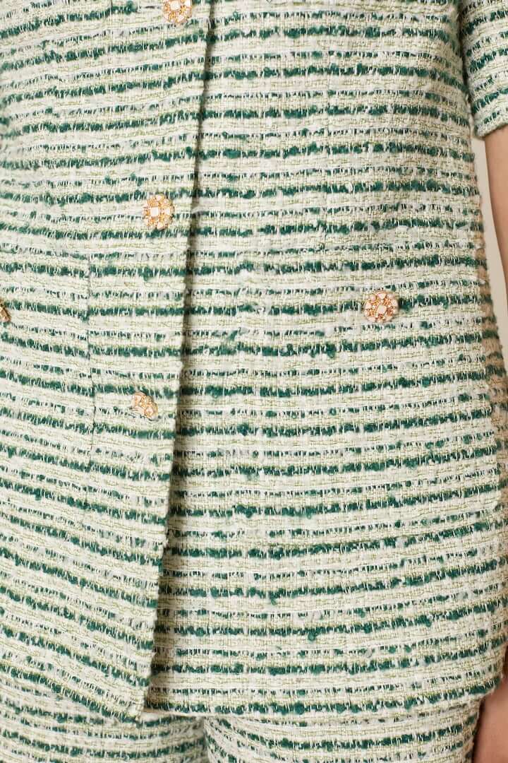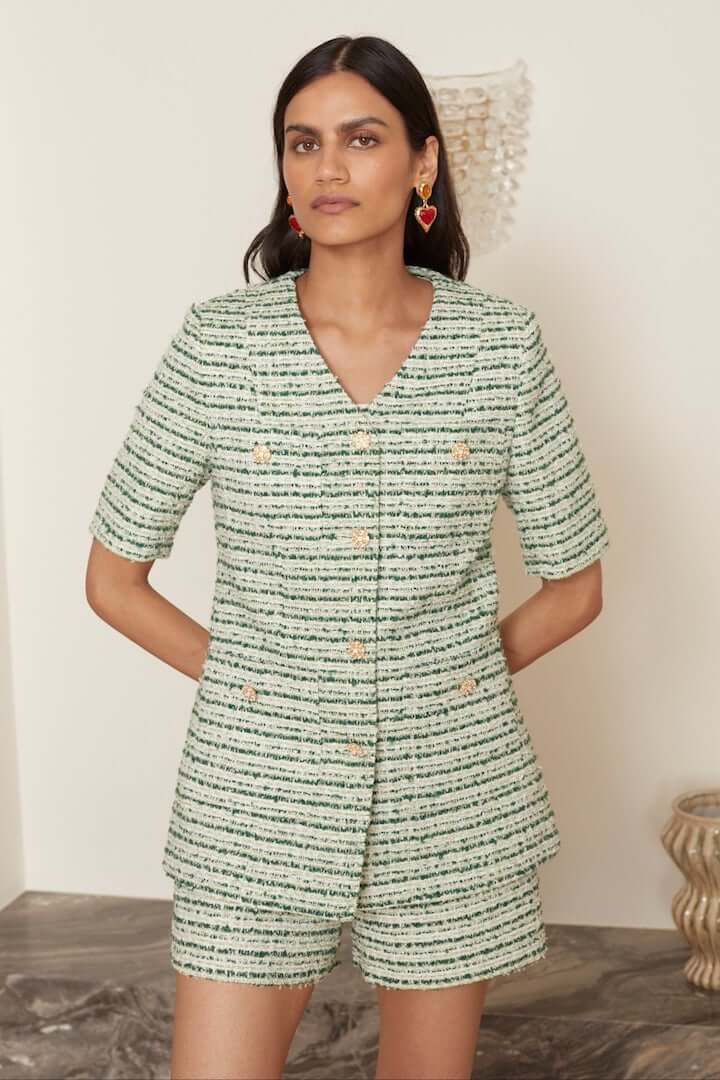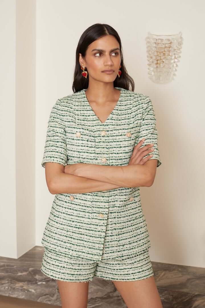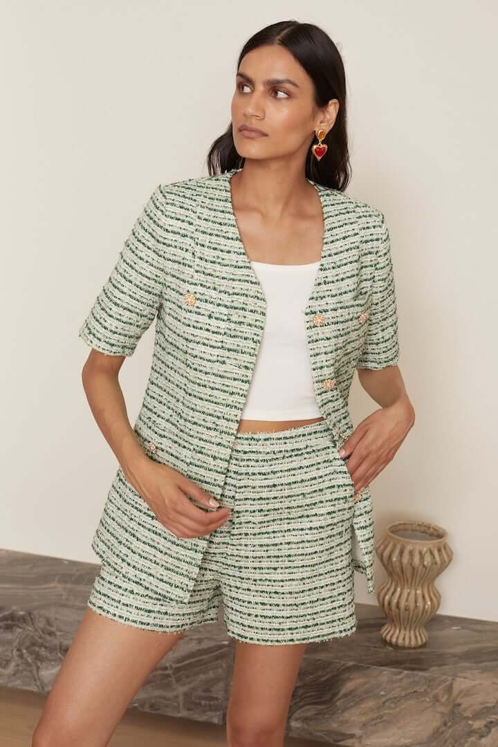 The cass jacket features a classic tweed style with a stylish striped pattern, perfectly complemented by a beautiful shade of green. Pair it with the kira shorts to complete a sophisticated and modern ensemble.
