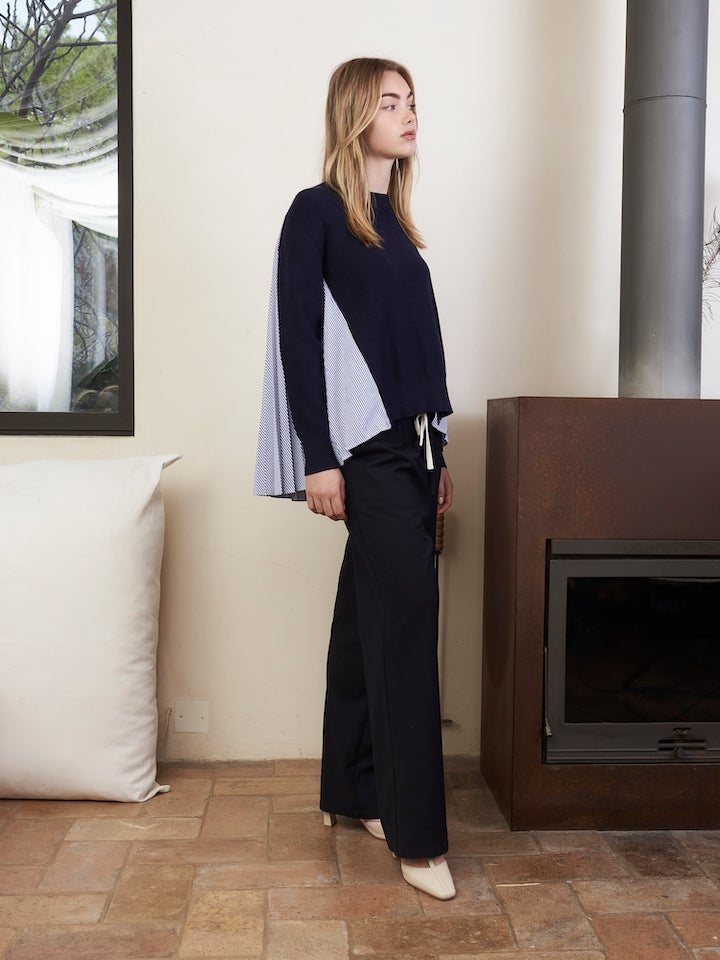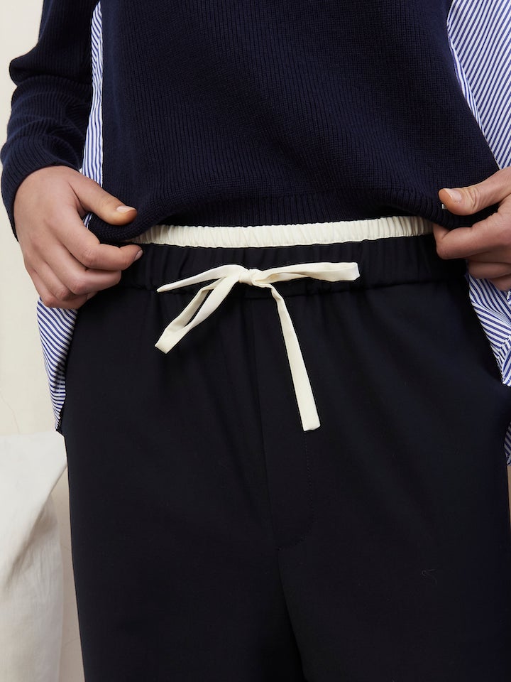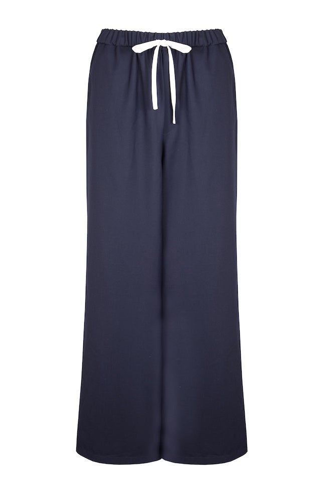 Roma Pants Available in gray or navy, these relaxed trousers offer endless styling possibilities. Wear it with a turtleneck for a professional look or with a t-shirt for a casual ensemble. The contrasting white waist adds a touch of comfort.