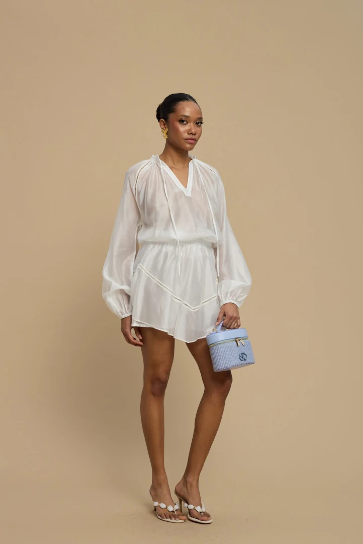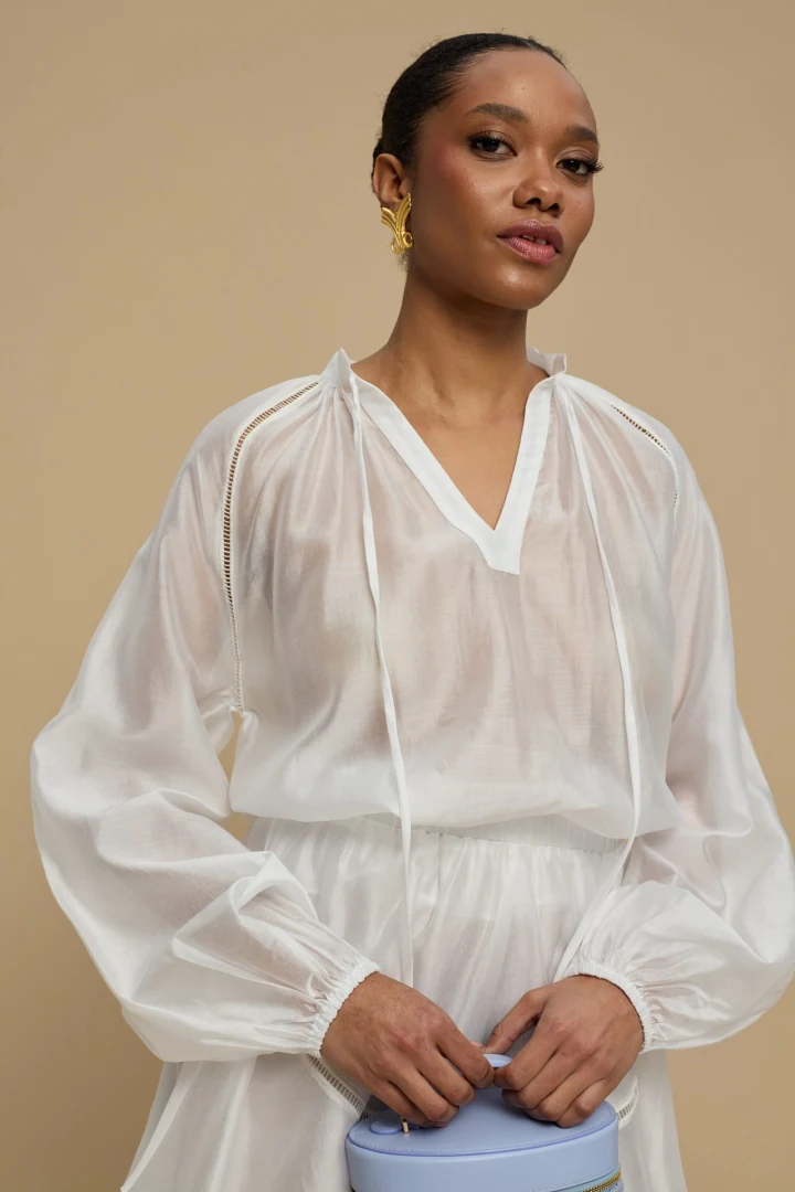 Ανανεώστε την ανοιξιάτικη σας γκαρνταρόμπα με το Estell Shirt White της La Chaine. Αυτή η κομψή sheer μπλούζα – πουκάμισο σε λευκή απόχρωση διαθέτει άνετη, oversized εφαρμογή. Είναι σχεδιασμένη με V λαιμόκοψη που συνοδεύεται από κορδόνια για δέσιμο, κλασικό γιακά και μακριά μανίκια που καταλήγουν σε ελαστικές μανσέτες. Κατασκευασμένο από ένα δροσερό μείγμα 85% Lyocell και 15% PES, το ύφασμα προσφέρει ανάλαφρη, ημιδιάφανη αίσθηση. Φορέστε το ιδανικά ως σετ με το ασορτί Estell Short για ένα ολοκληρωμένο, αέρινο look.