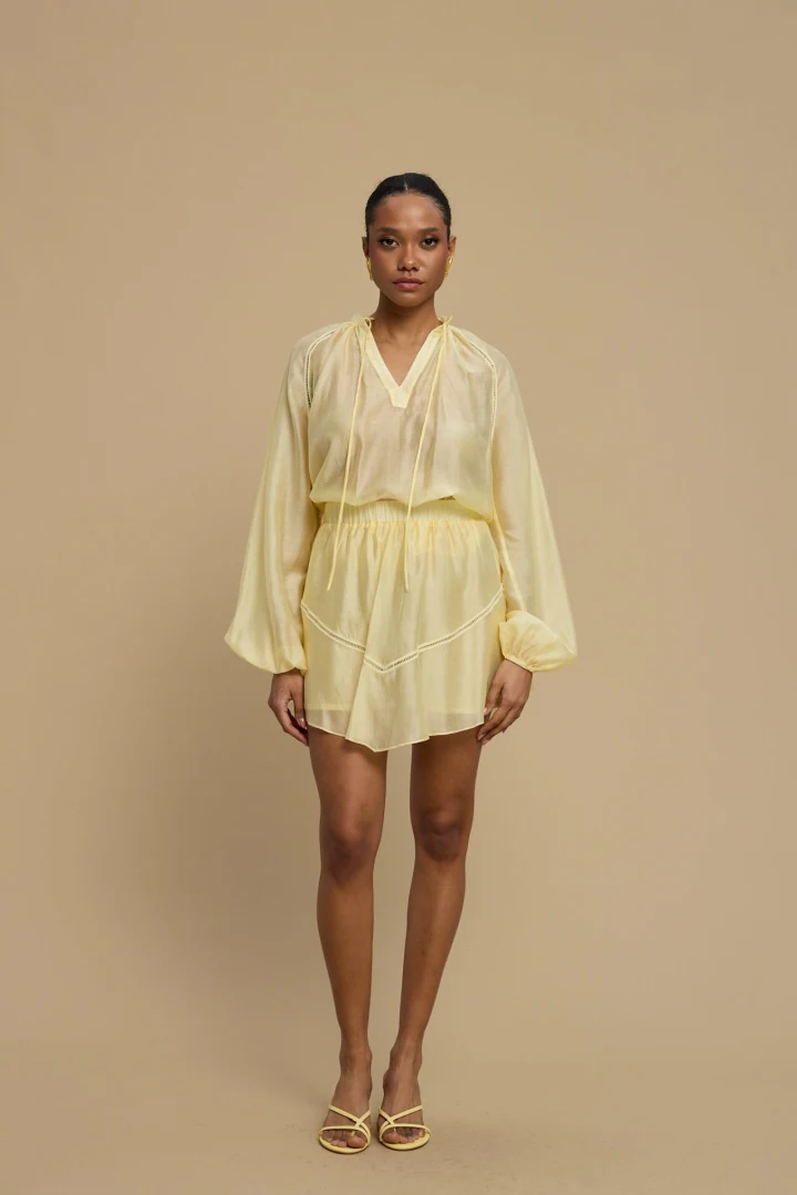 Ολοκληρώστε την καλοκαιρινή σας γκαρνταρόμπα με την Estell Skirt Yellow της La Chaine. Αυτή η εντυπωσιακή sheer φούστα σε φωτεινή κίτρινη απόχρωση προσφέρει άνετη, oversized εφαρμογή. Για απόλυτη ελευθερία κινήσεων και ασφάλεια όλη τη μέρα, διαθέτει ενσωματωμένο εσωτερικό σορτσάκι (inner shorts) και πρακτική ελαστική μέση που προσαρμόζεται τέλεια στο σώμα. Κατασκευασμένη από δροσερό μείγμα 85% Lyocell και 15% PES, χαρίζει ανάλαφρη, ημιδιάφανη αίσθηση. Φορέστε τη ως σετ με το ασορτί Estell Shirt για ένα αέρινο, ολοκληρωμένο look.