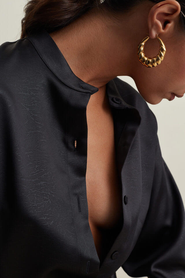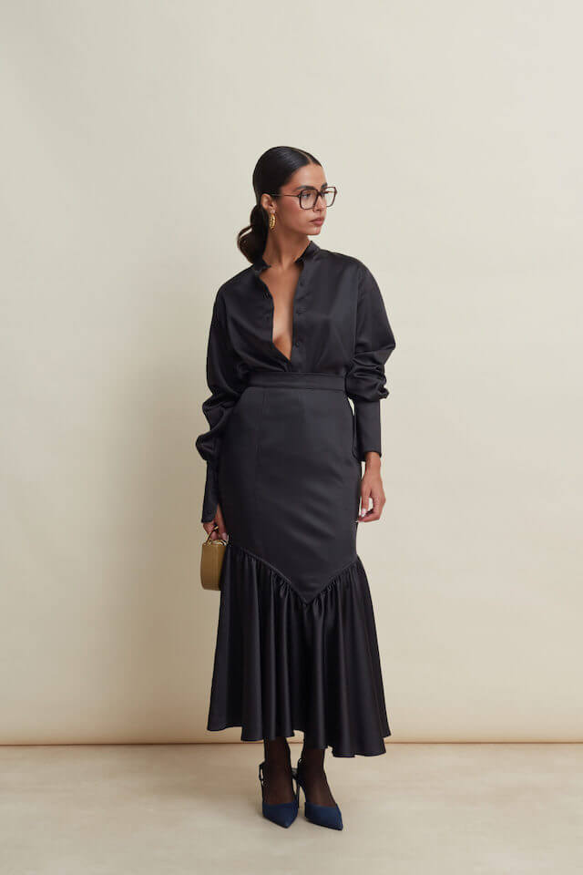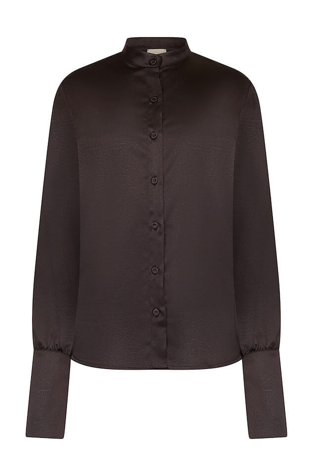 Ένα μεταξένιο πουκάμισο σε μαύρη απόχρωση. Ένα απαραίτητο κομμάτι της γκαρνταρόμπας του γραφείου σας. Κανονική εφαρμογή και υφασμάτινα κουμπιά. Ταιριάξτε το με Lilith Pants και Kallisti Bag για το τέλειο μονόχρωμο σύνολο.