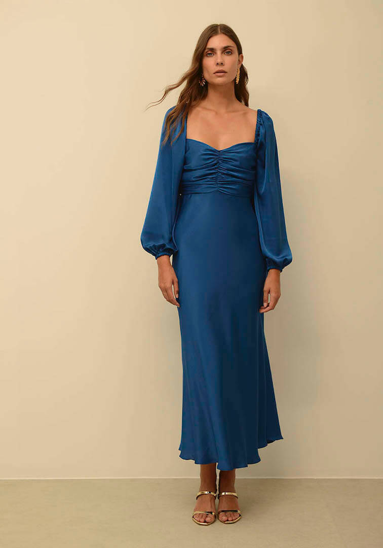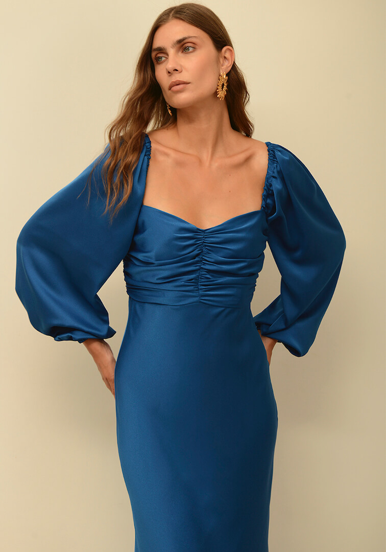 Elegant midi dress with long sleeves in crepe satin fabric and pleats on the bodice. Square neckline and back zipper. If you are between two sizes we recommend buying the smaller one.