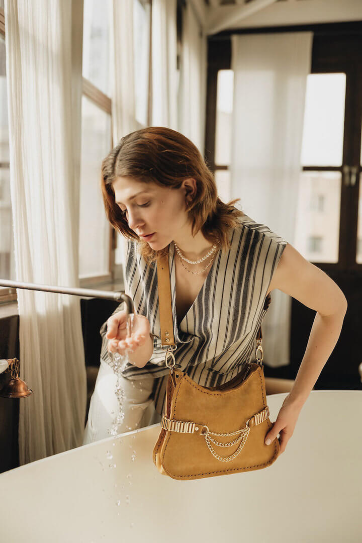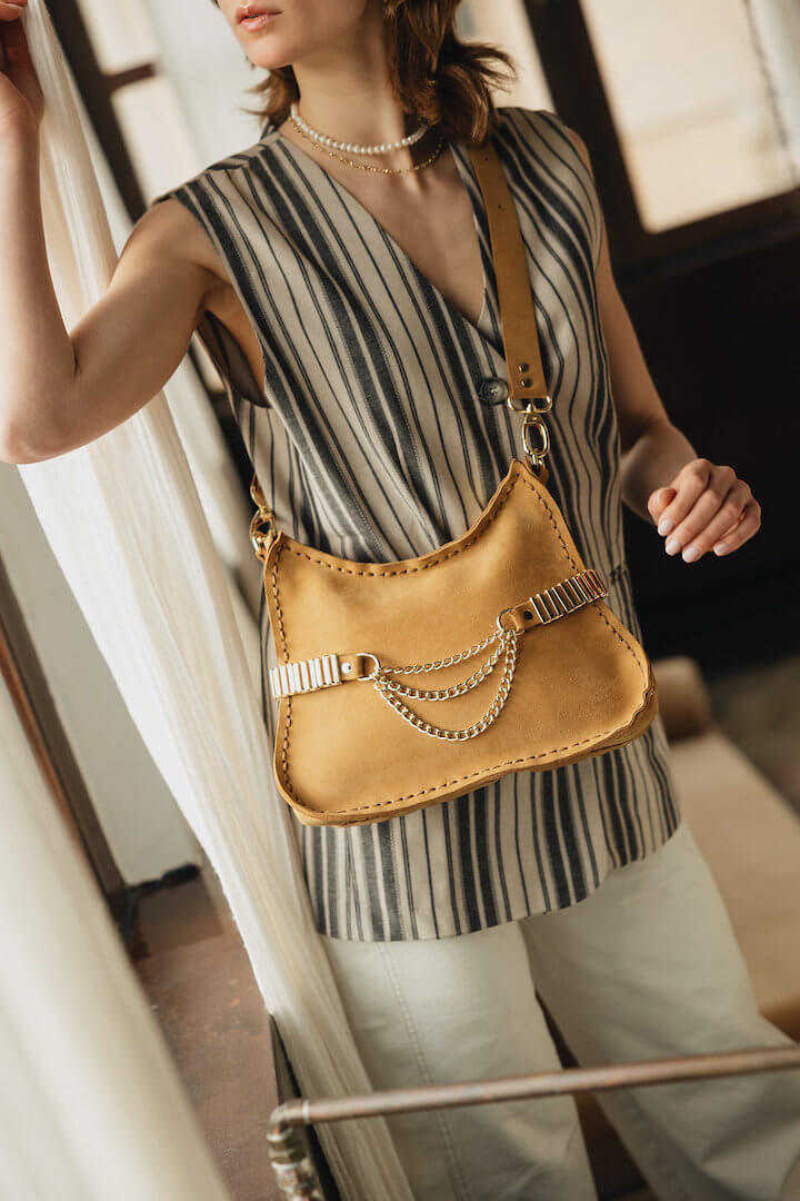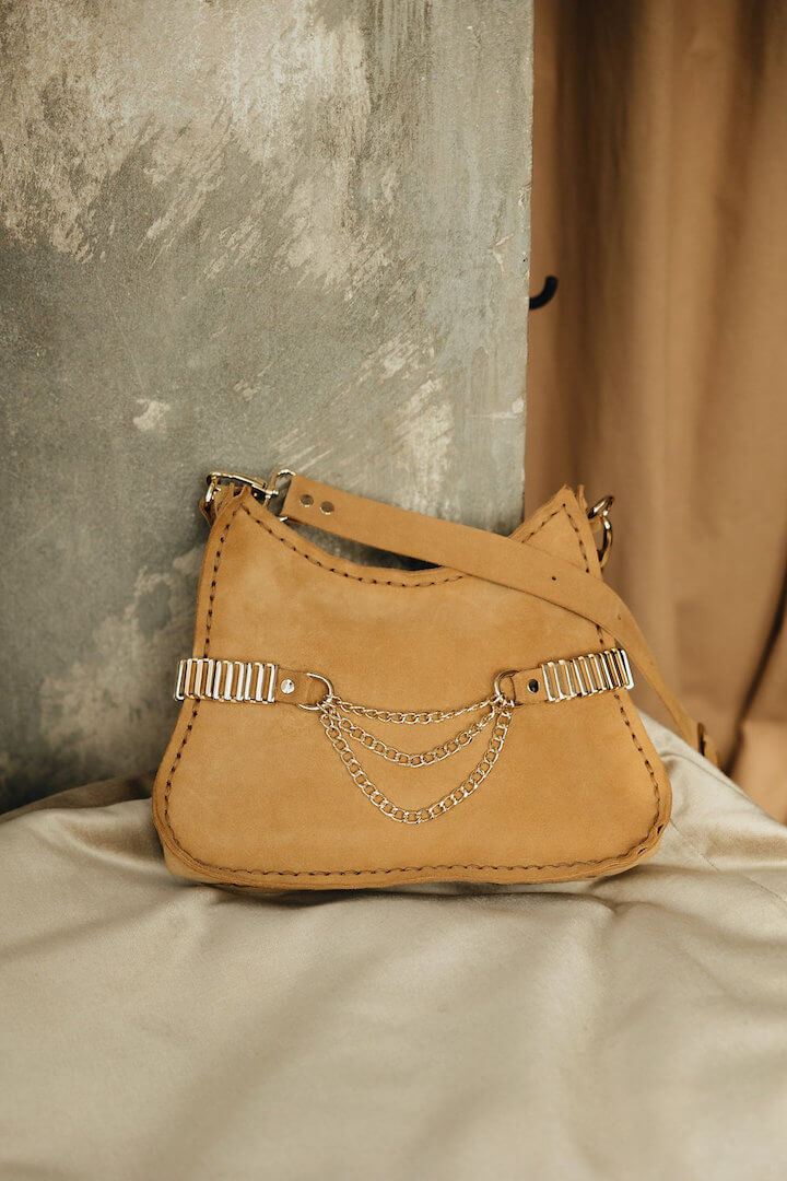 Handmade leather shoulder bag with nickel metal elements. It closes with a zipper and includes a detachable leather wallet inside.
