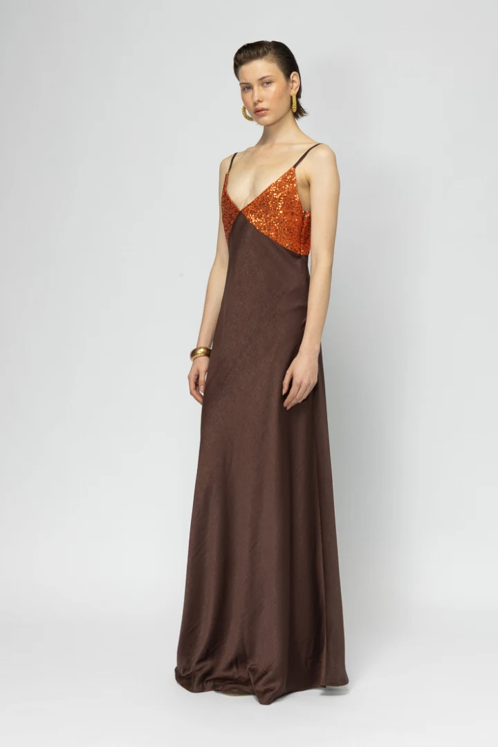 Μαγνητίστε τα βλέμματα σε κάθε σας επίσημη έξοδο με το εκθαμβωτικό Cyra Brown Dress από τη Mallory The Label. Αυτό το εντυπωσιακό γυναικείο καφέ slip dress αποτελεί την επιτομή της διακριτικής πολυτέλειας (“subtle shine”). Πρόκειται για ένα ρευστό, maxi φόρεμα που αγκαλιάζει ομοιόμορφα τη σιλουέτα σας χάρη στην κομψή, στενή του εφαρμογή (fitted). Οι λεπτές, ντελικάτες τιράντες σε συνδυασμό με τα στρατηγικά τοποθετημένα πάνελ από πούλιες (sequin panels), του χαρίζουν μια απαλή, εκλεπτυσμένη φωτεινότητα, καθιστώντας το απόλυτα understated και elegant. Η προσεγμένη σύνθεσή του από 56% ρεγιόν (rayon) και 44% πολυεστέρα προσφέρει μια υπέροχη, χυτή πτώση που ακολουθεί αρμονικά την κάθε σας κίνηση, εξασφαλίζοντας ταυτόχρονα άνεση και πολυτελή αίσθηση. Είναι η απόλυτη επιλογή για βραδινές, statement εμφανίσεις. Συνδυάστε το με minimal ψηλοτάκουνα πέδιλα και διακριτικά κοσμήματα για να αναδείξετε την softly luminous αισθητική του.