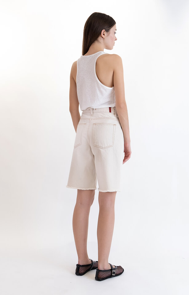 Women's shorts that stop above the knee, designed in a high-waisted comfortable line and with ruffles at the end for a vintage feel. Martina in Cream shade is fitted in the waist and comfortable in the thighs. Wear it with crop tops or t-shirts and give it the color you want with sneakers or open sandals.