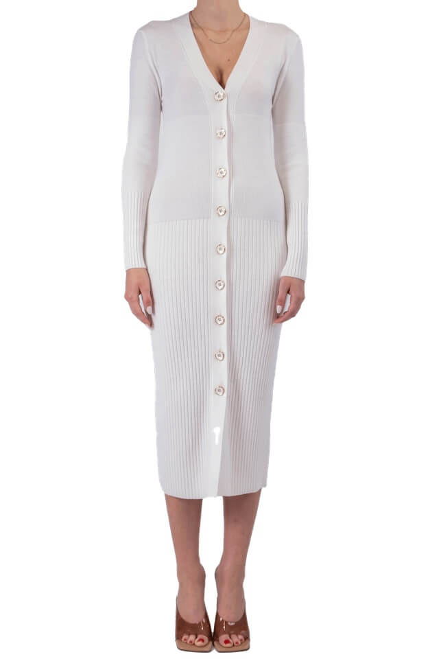 The Mattea knitted dress, comfortable and light, is an all day elegant dress for every occasion from morning to evening. The button opening accentuates the silhouette and details of the body, combine it with a jean jacket and leather loafers.