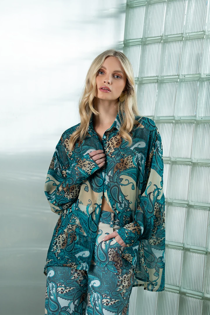 Κάντε την απόλυτη statement εμφάνιση και ανανεώστε το στυλ σας με το εκθαμβωτικό Blue Shirt από τη MELIKA. Αυτό το ακαταμάχητο γυναικείο πουκάμισο ξεχωρίζει χάρη στο μοναδικό, περίπλοκο τύπωμά του, το οποίο παντρεύει αριστοτεχνικά τα κλασικά λαχούρια (paisley print) με δυναμικές animal print λεπτομέρειες σε μαγευτικές μπλε και τιρκουάζ αποχρώσεις. Είναι σχεδιασμένο σε εξαιρετικά άνετη, oversized γραμμή που αγκαλιάζει αέρινα και κολακεύει κάθε σωματότυπο. Ο “έξυπνος” one-size σχεδιασμός του προσαρμόζεται ιδανικά, καλύπτοντας τέλεια μεγέθη από XSmall έως XLarge. Κατασκευασμένο στην Ελλάδα (Made in Greece) από υψηλής ποιότητας τυπωμένο ύφασμα silky μουσελίνας (100% πολυεστέρας), προσφέρει μια πολυτελή, μεταξένια αίσθηση στο δέρμα και υπέροχη ρευστότητα στην κίνηση. Ο εκλεπτυσμένος σχεδιασμός του ολοκληρώνεται με κομψό κούμπωμα στο κέντρο εμπρός με κρυφή πατιλέτα, για ένα αψεγάδιαστο, μίνιμαλ φινίρισμα που αφήνει το μοτίβο να κλέψει την παράσταση. Φορέστε το ως μέρος ενός εκρηκτικού co-ord set, δετό στη μέση ή εντελώς ριχτό για τα πιο κομψά resort looks!
