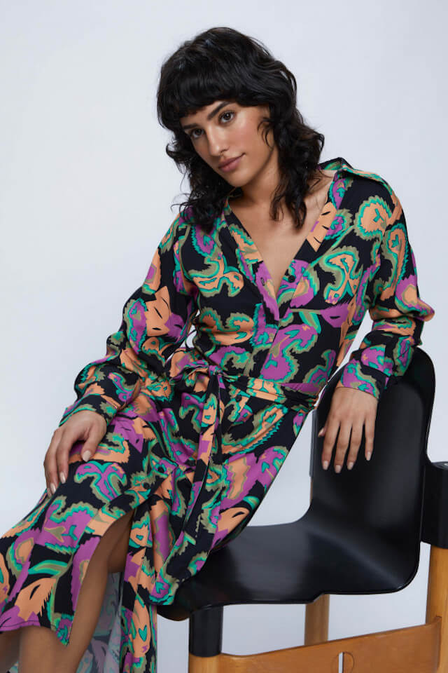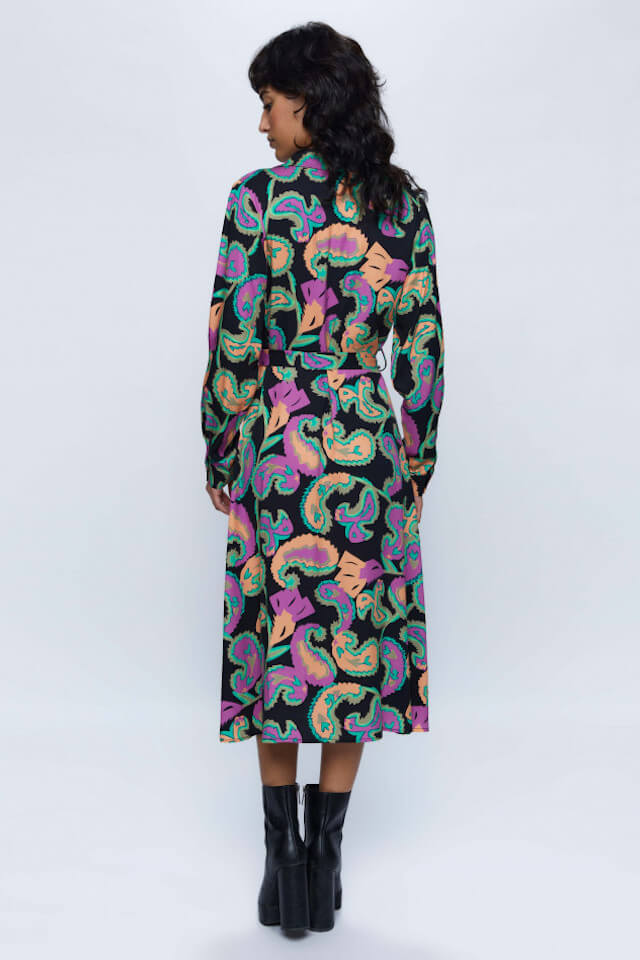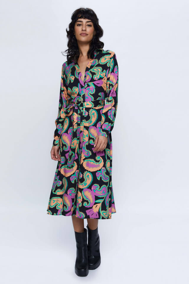 Midi shirt dress with colorful paisley print. With a lapel collar and long sleeves finished with buttoned cuffs. Front button and belt closure. The model is 170 cm tall and wears a size S.