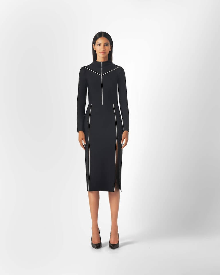 Stretch midi dress. With a closed neckline and white ruffles that add sharp contrast, a decorative, modern character to the dress and emphasize its design by adding a dose of dynamism.