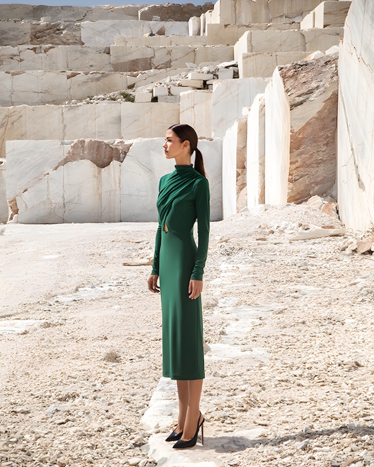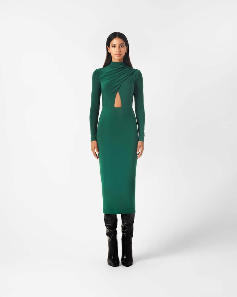 In a warm emerald green color and with a closed neckline, it captivates the eyes as the opening under the bust gives a sensual touch to the dress, highlighting femininity and elegance.