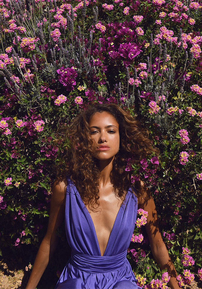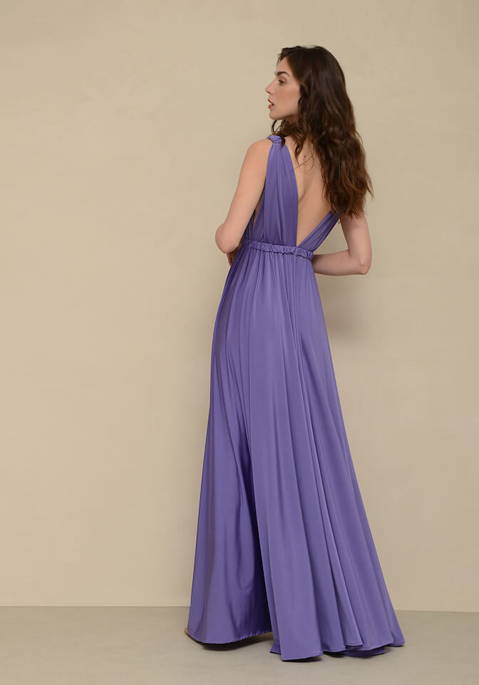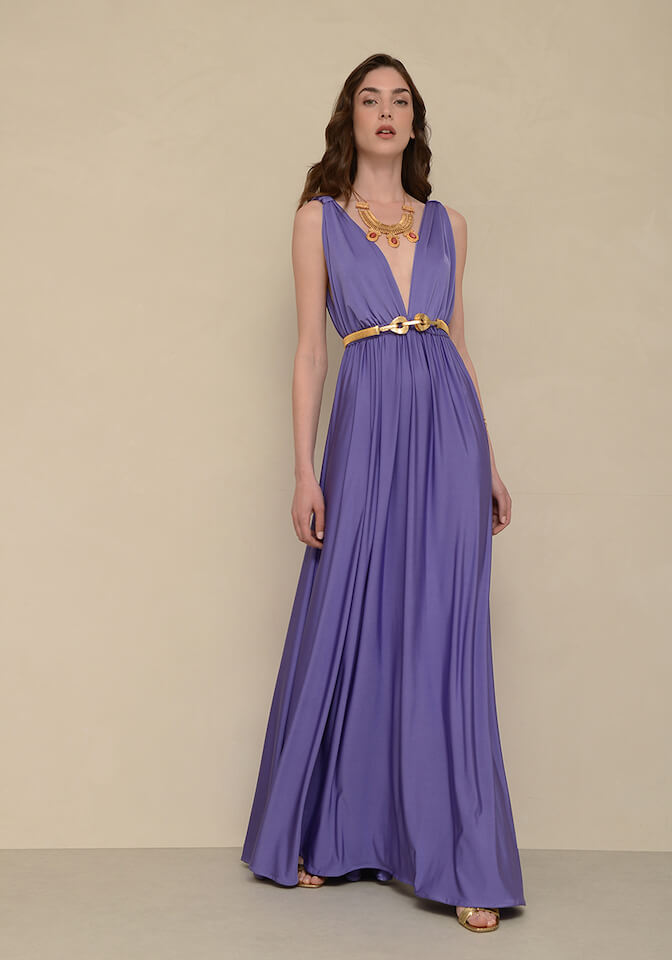 Jersey dress with a deep V, side slits and an A-line skirt.
