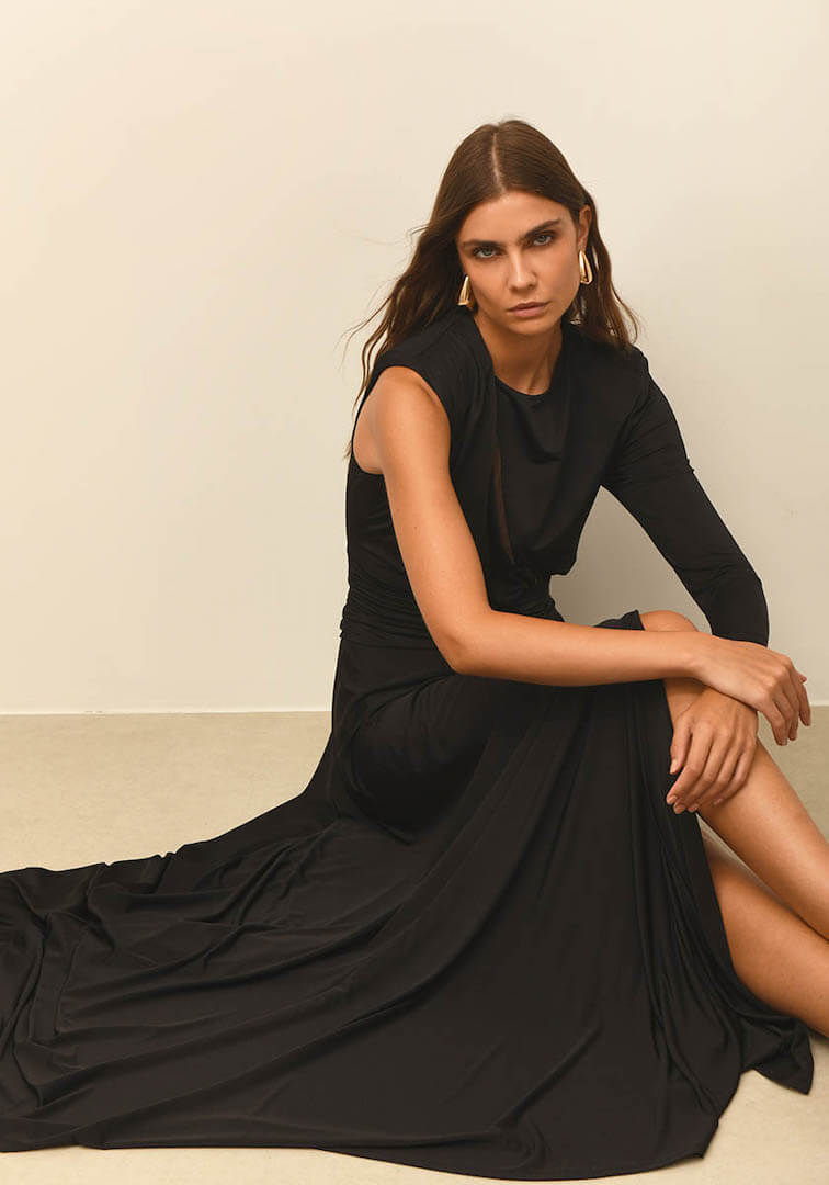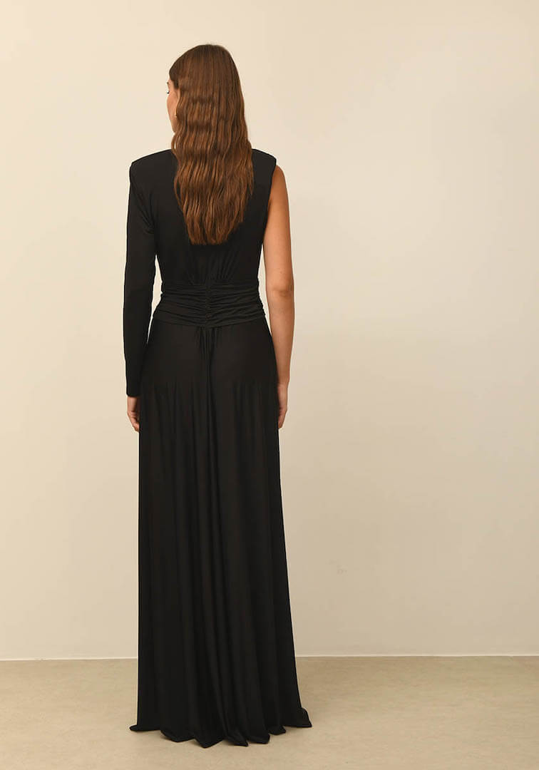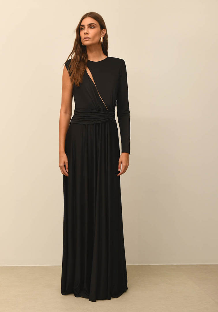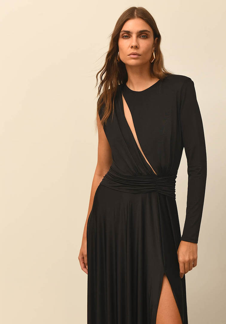 Long dress in jersey stretch fabric with one sleeve. Especially open with transparency on the chest and detail on the waist with souras. A-line skirt with front slit. Zipper at the back.