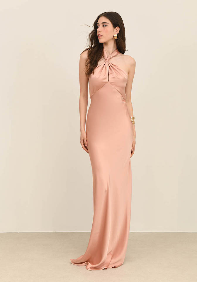 Long dress in satin fabric, halter neckline and straight line skirt. Open back & back zipper.