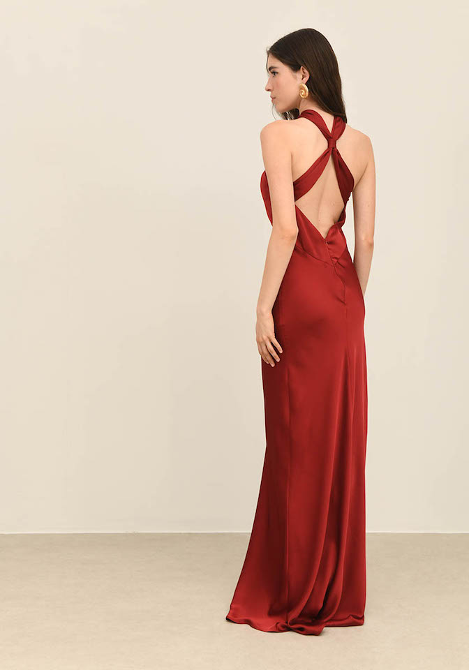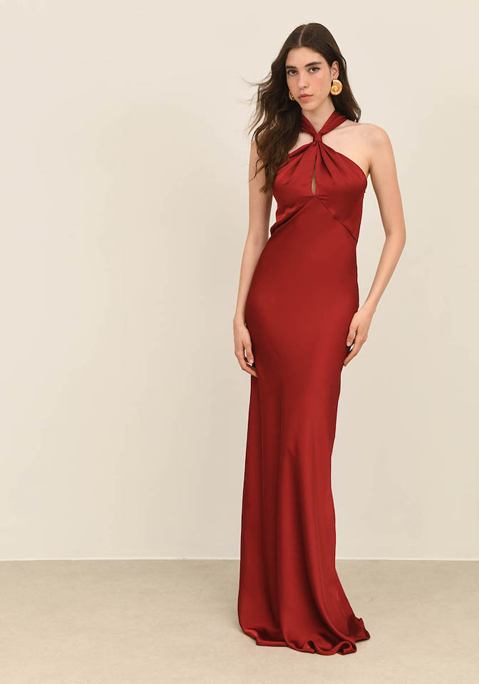 Long dress in satin fabric, halter neckline and straight line skirt. Open back & back zipper.