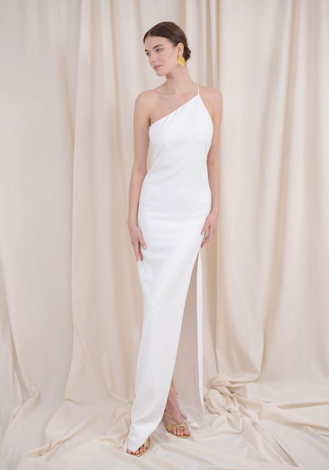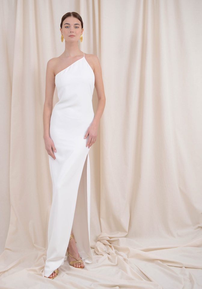 Long dress in crepe fabric with an impressive back. Front opening and side zipper.
