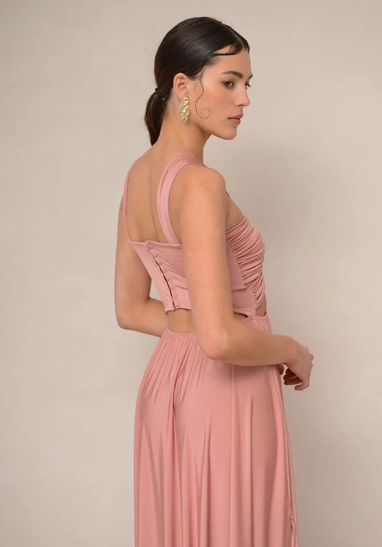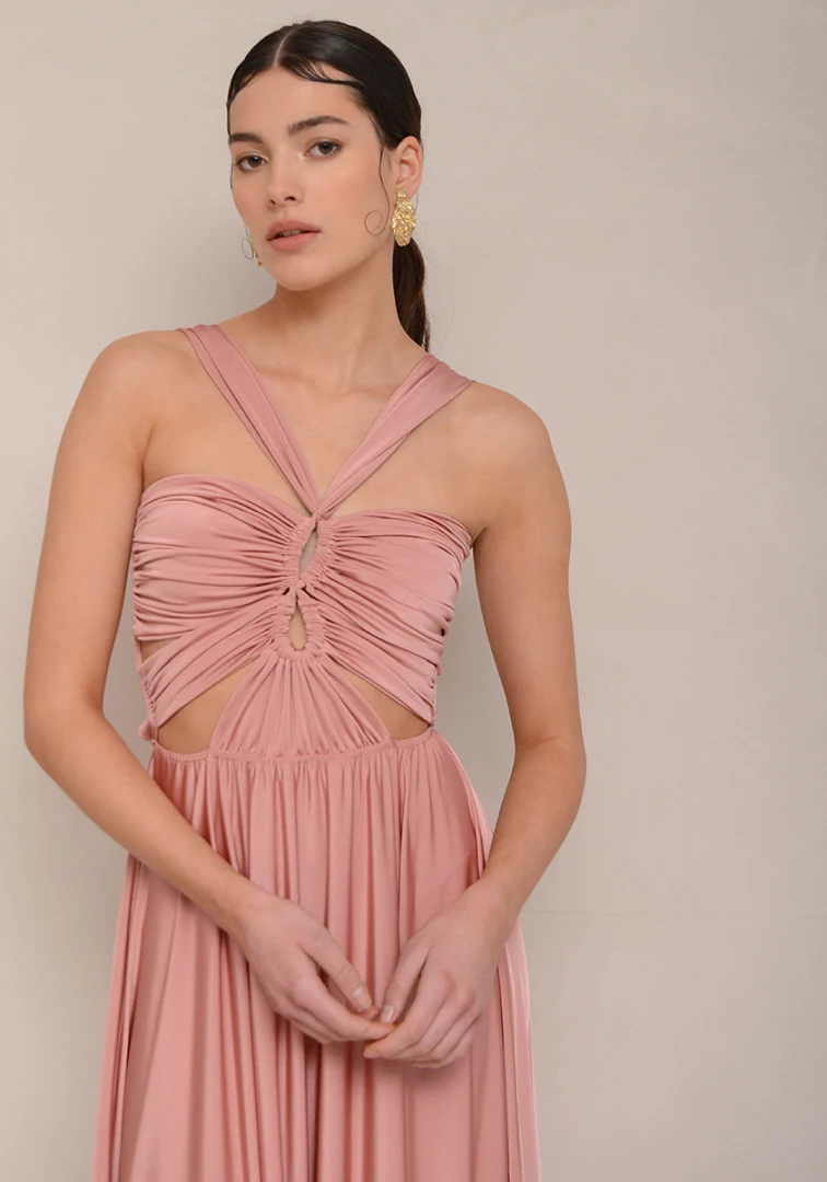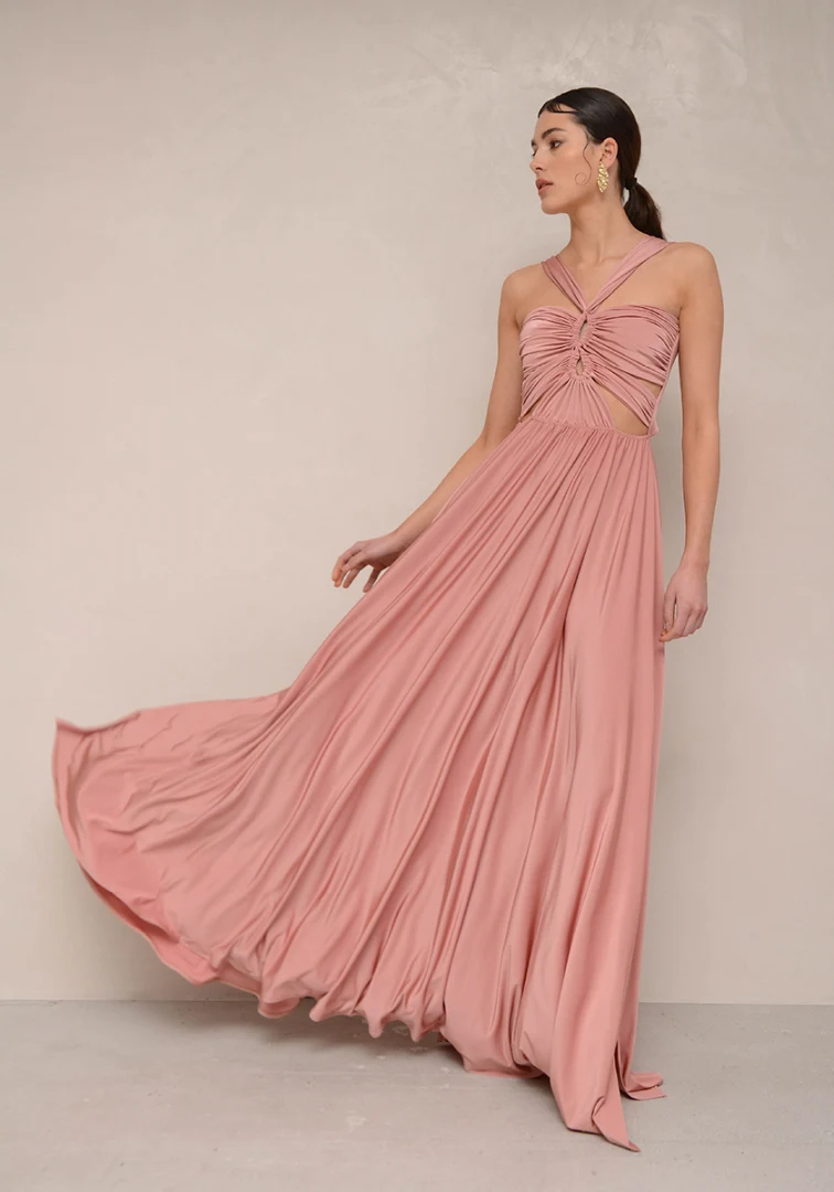 Long dress made of elastic fabric with special geometric elements on the bodice and light opening in an "A" line.