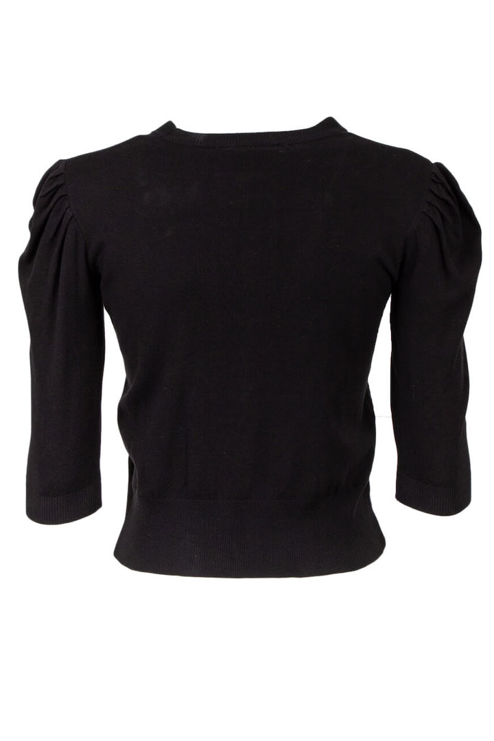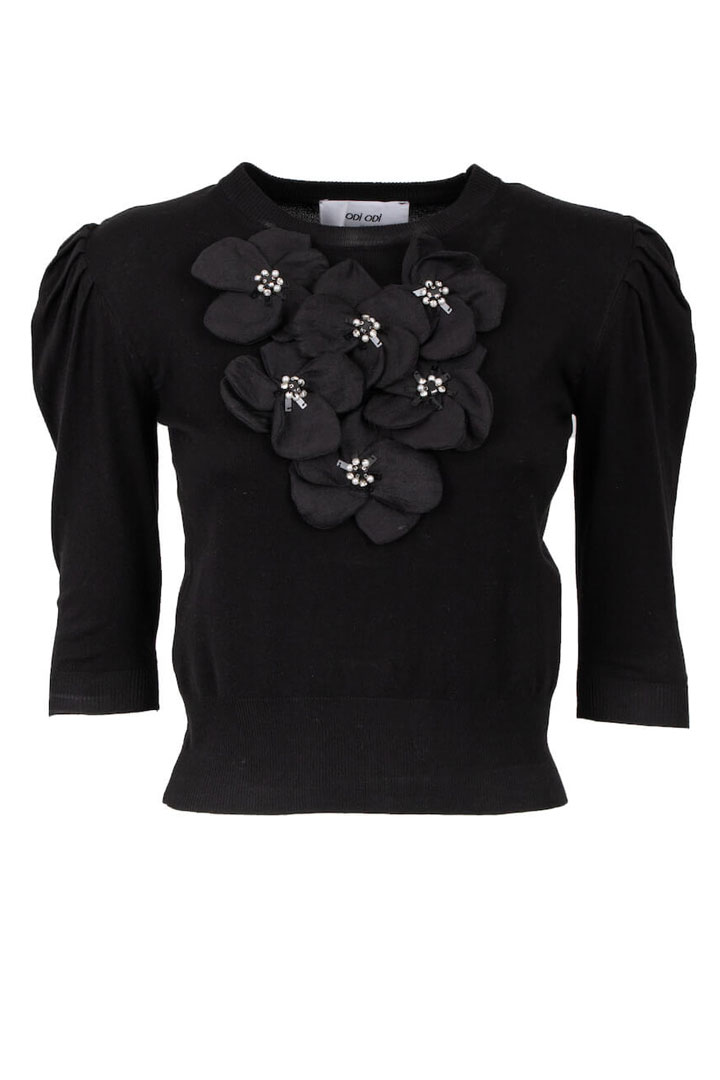 Odi Odi knitted black blouse with decorative flowers on the front and round neckline.