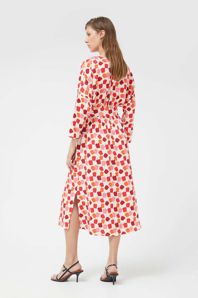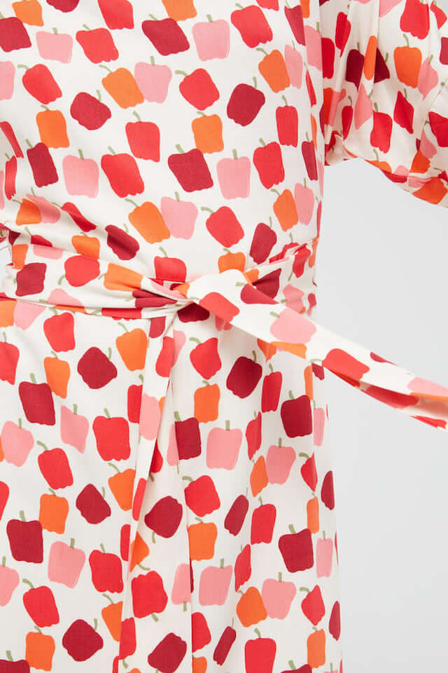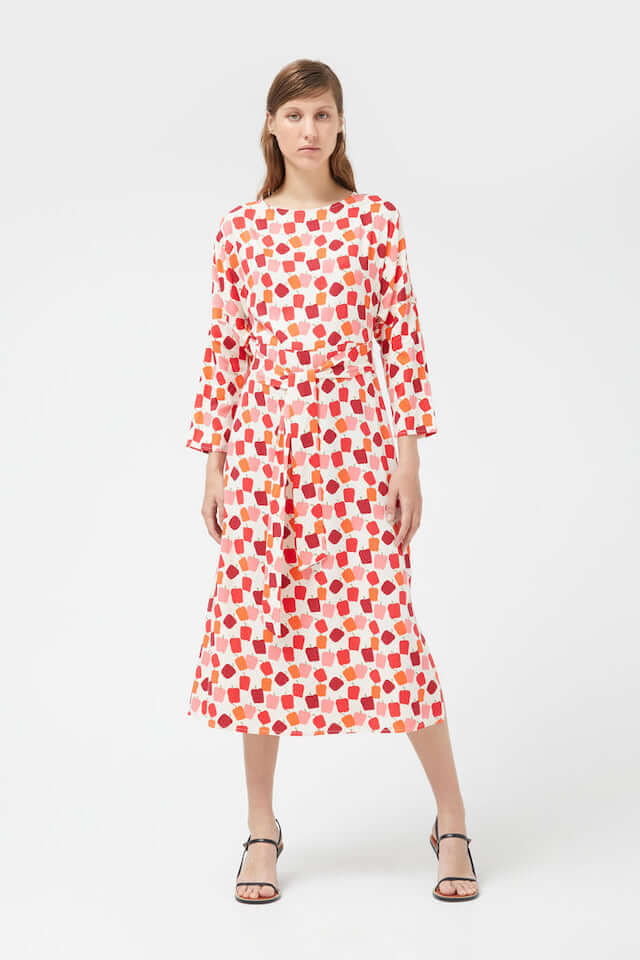 Midi dress in viscose twill with pepper print. With boat neck and French sleeves. Belt detail. The model is 177 cm tall and wears size S.