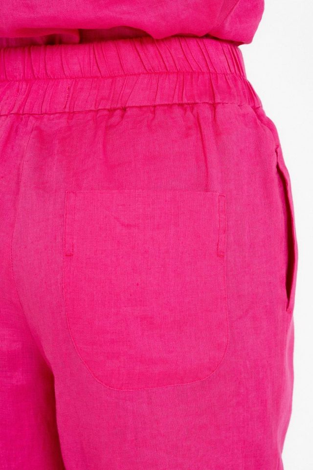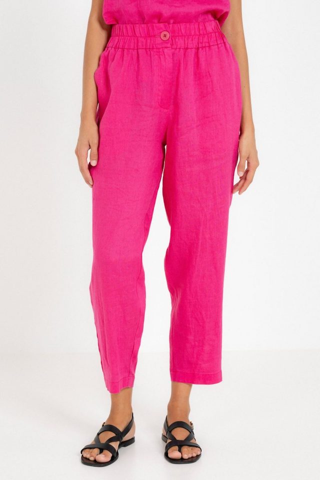 High-waisted linen trousers with an elastic waist and button closure at the front. Side pockets. Color fuchsia.
