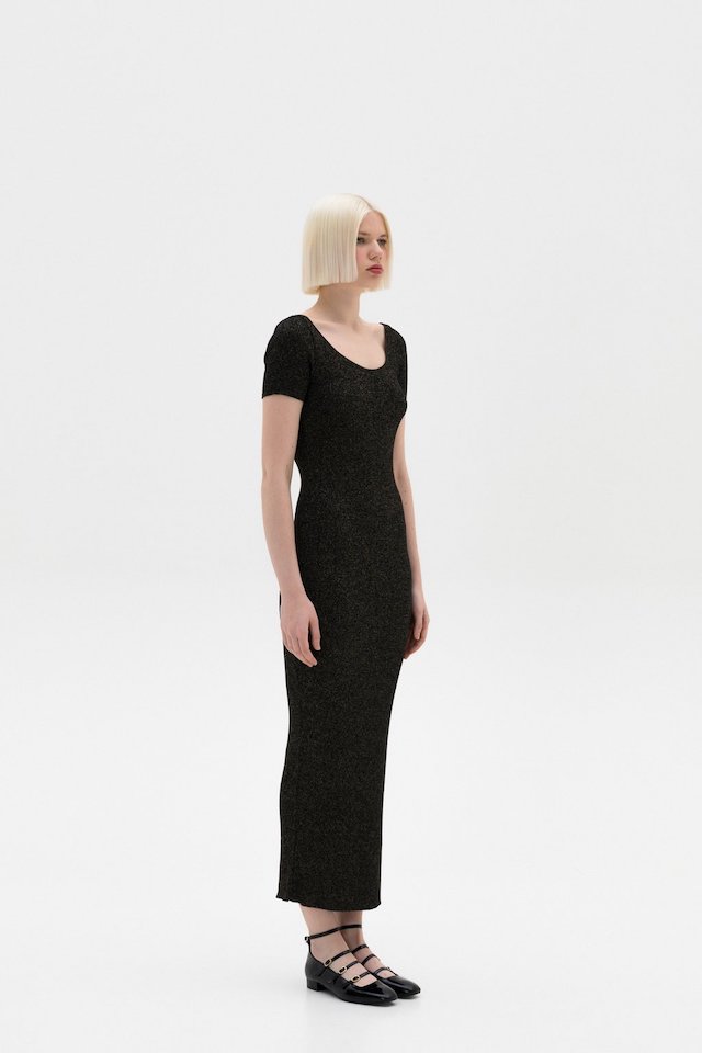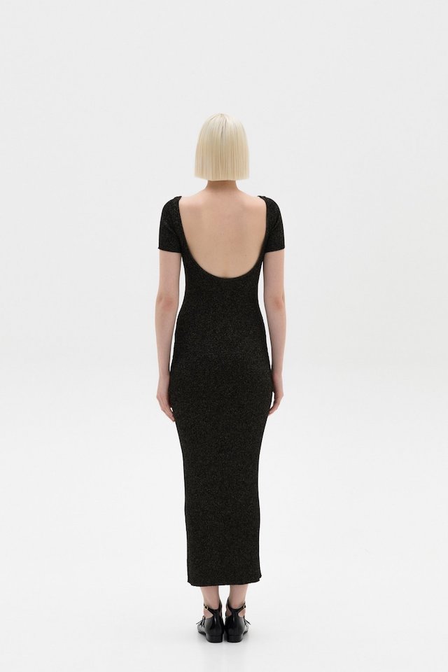 Lurex midi elastic, knitted dress with short sleeves. The back is low.
