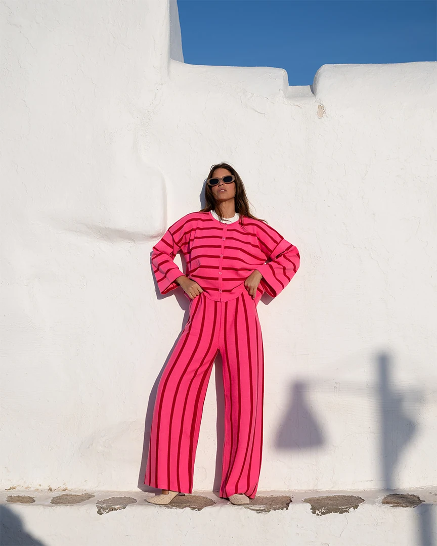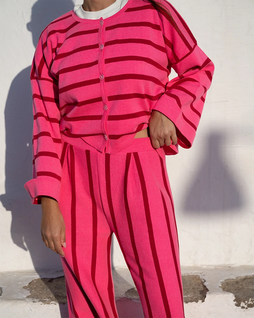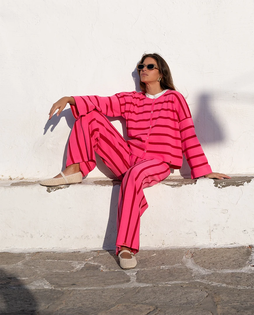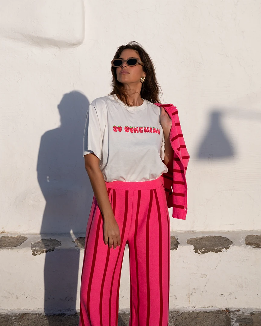 Απογειώστε το καθημερινό σας στυλ με το εντυπωσιακό Rose Trousers (Fuchsia) από τη SOBOHEMIAN. Αυτό το υπέροχο γυναικείο πλεκτό παντελόνι μαγνητίζει τα βλέμματα χάρη στο ζωηρό ριγέ μοτίβο του σε έντονες φούξια αποχρώσεις. Είναι σχεδιασμένο με γνώμονα την απόλυτη άνεση, προσφέροντας χαλαρή εφαρμογή με μακριά μπατζάκια που κολακεύουν τη σιλουέτα, και πρακτικό λάστιχο στη μέση (διατίθεται σε δύο μεγέθη: S/M και M/L). Κατασκευάζεται εξ ολοκλήρου στην Ελλάδα από εξαιρετικής ποιότητας νήμα (50% βαμβάκι, 50% ακρυλικό), χαρίζοντας απαλή αίσθηση και ζεστασιά. Αποτελεί ένα ξεχωριστό ρούχο ηθικής μόδας, ραμμένο με αγάπη σε μικρές εγχώριες βιοτεχνίες (σε αντικαπνιστικό περιβάλλον), και φτάνει στα χέρια σας μέσα σε μια κομψή, οικολογική τσάντα δώρου.