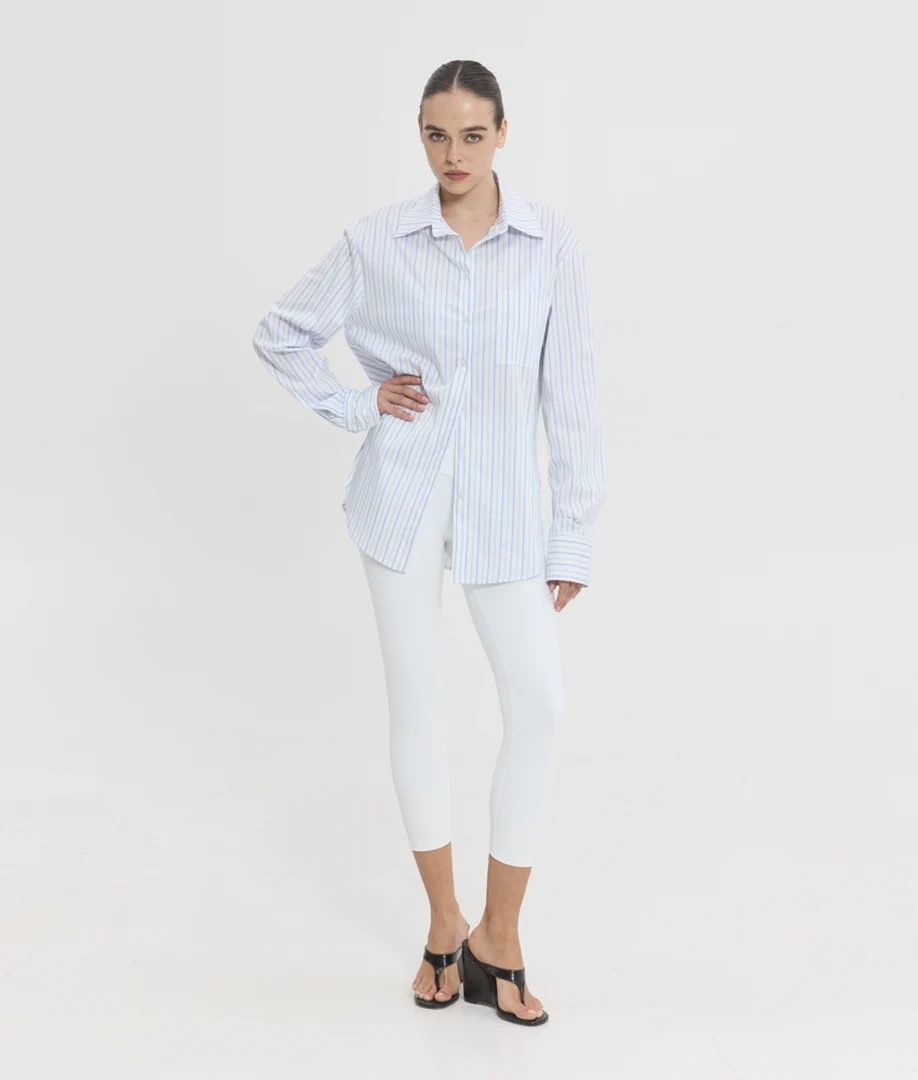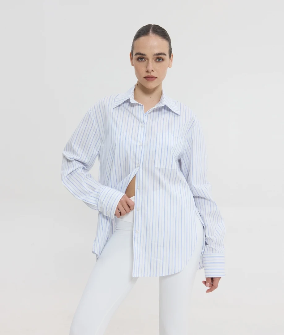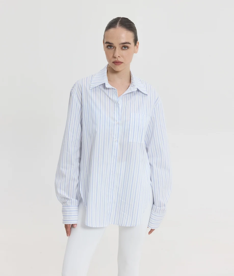 Εμπλουτίστε τη συλλογή σας με ένα απόλυτα διαχρονικό κομμάτι που αποπνέει αβίαστη φινέτσα, το Reina Shirt από τη Sunsetgo. Αυτό το κλασικό γυναικείο ριγέ πουκάμισο σε φρέσκες λευκές και μπλε αποχρώσεις, αποτελεί την επιτομή του “casual chic” ντυσίματος. Η άνετη γραμμή του εναρμονίζεται υπέροχα με τον παραδοσιακό γιακά και το πρακτικό κλείσιμο με κουμπιά, προσφέροντας ένα ρούχο-πασπαρτού για αμέτρητους στιλιστικούς συνδυασμούς. Κατασκευασμένο αποκλειστικά από 100% αγνό βαμβάκι (cotton), εγγυάται μέγιστη αναπνοή του δέρματος, απαλή υφή και δροσερή αίσθηση όλη την ημέρα. Φορέστε το αυστηρά κουμπωμένο για ένα κομψό πρωινό office look, ή αφήστε το ανοιχτό σαν ελαφρύ πανωφόρι (layering) πάνω από το αγαπημένο σας bralette για την τέλεια street style εμφάνιση.