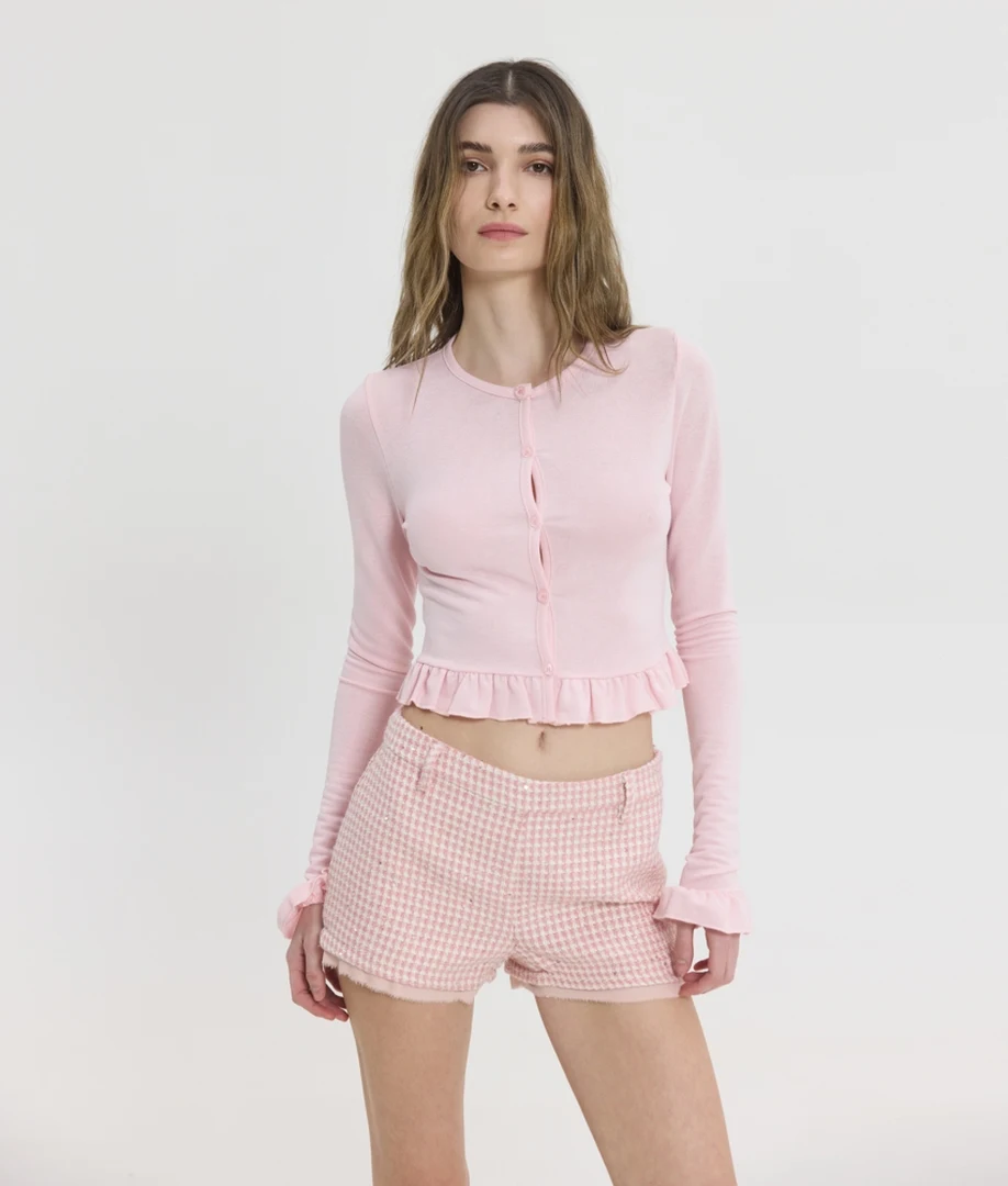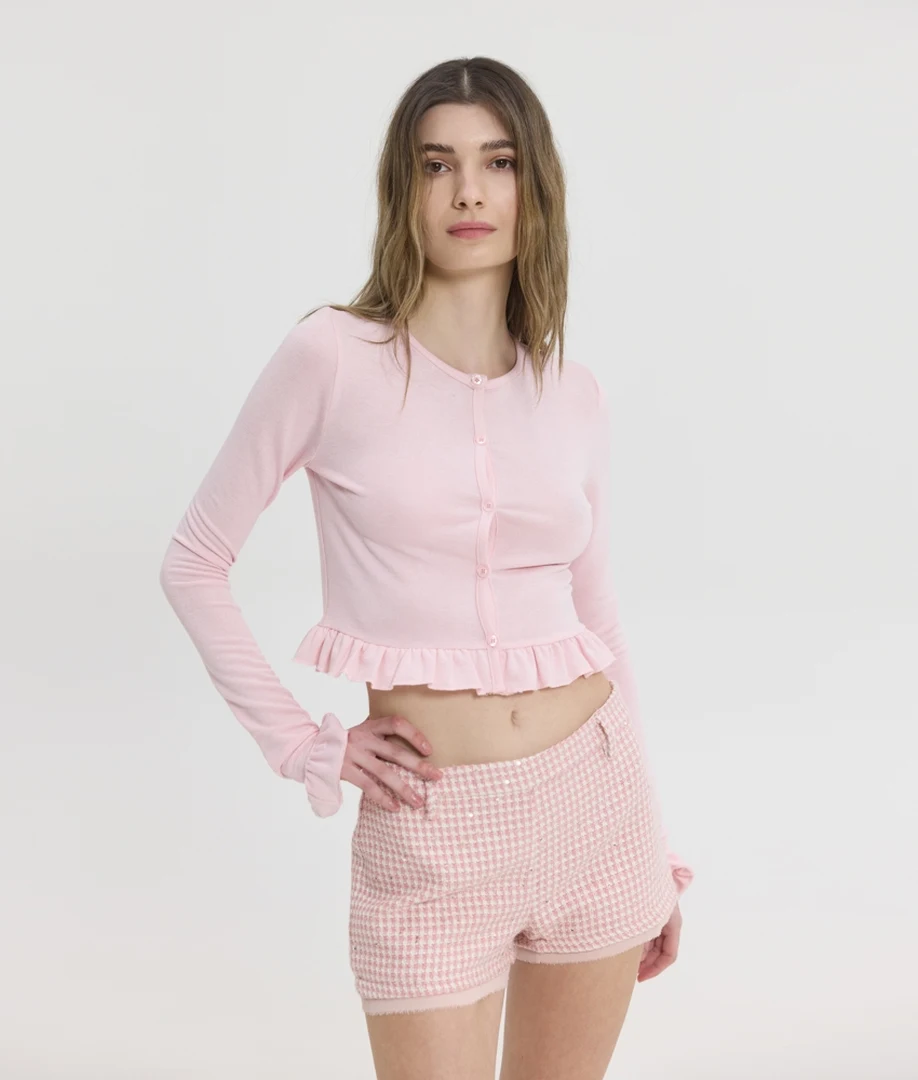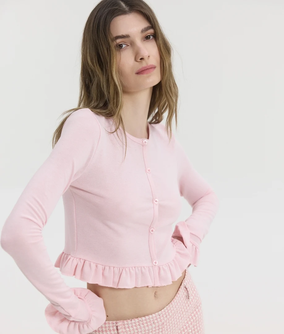 Δώστε μια γλυκιά, ρομαντική πινελιά στις καθημερινές σας εμφανίσεις με την Violette Cardi στην υπέροχη ροζ (pink) απόχρωση από τη Sunsetgo. Αυτό το κομψό γυναικείο ζακετάκι ξεχωρίζει αμέσως χάρη στα ντελικάτα τελειώματα με βολάν (ruffled hems), τα οποία προσδίδουν έναν παιχνιδιάρικο και άκρως θηλυκό χαρακτήρα στο σύνολό σας. Το πρακτικό κλείσιμο με κουμπιά στο μπροστινό μέρος σάς επιτρέπει να το αξιοποιήσετε με πολλαπλούς τρόπους: φορέστε το απόλυτα κουμπωμένο ως ένα εντυπωσιακό, εφαρμοστό τοπ, ή αφήστε το ανοιχτό για το ιδανικό ανοιξιάτικο layering πάνω από basic t-shirts και bralettes. Η εξαιρετικής ποιότητας σύνθεσή του από 76% βισκόζη, 20% πολυεστέρα και 4% spandex εγγυάται μια απίστευτα μαλακή υφή, δροσερή αίσθηση και την τέλεια ελαστικότητα που αγκαλιάζει φυσικά το σώμα. Διαθέσιμο σε μεγέθη S, M και L, αποτελεί το απόλυτο ελαφρύ πανωφόρι για να ολοκληρώσετε τα casual chic looks σας.