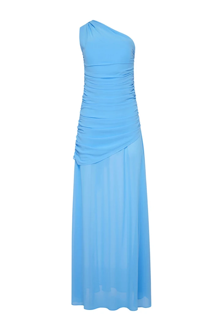 A maxi dress with one shoulder detailing and a cape over the shoulders. Lightweight fabric, draped design with details to hug and flatter the body.