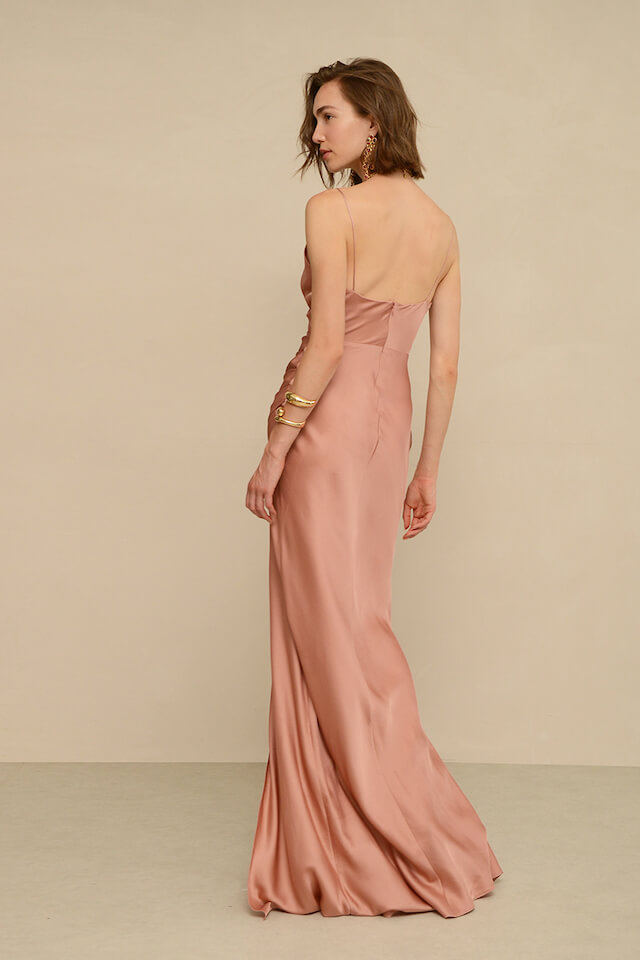 Long dress in satin fabric. V-neckline with straps and eye-catching design on the front. Side opening.