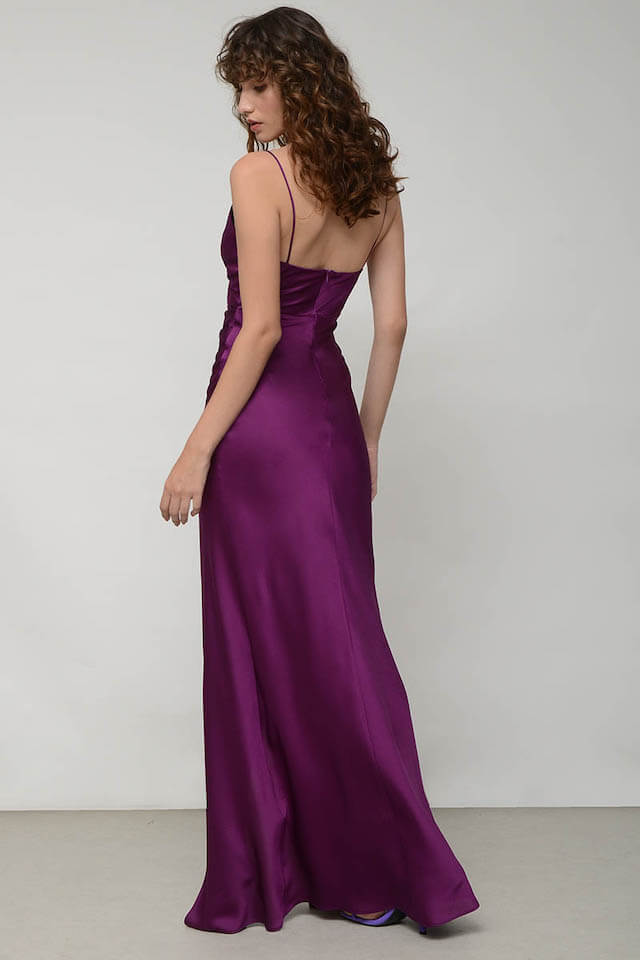 Long dress in satin fabric. V-neckline with straps and eye-catching design on the front. Side opening.