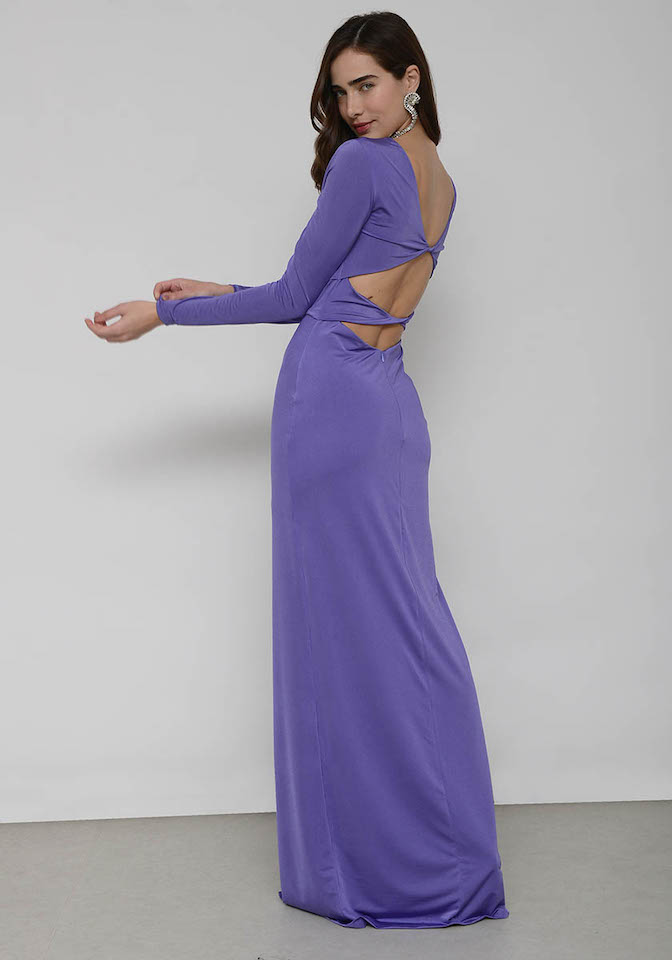 Maxi long sleeve dress crafted from elastic fabric. V neckline and impressive details with belt from the same fabric. Zipper on the back side.