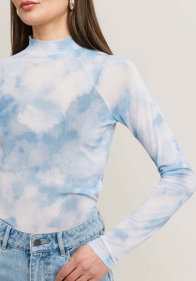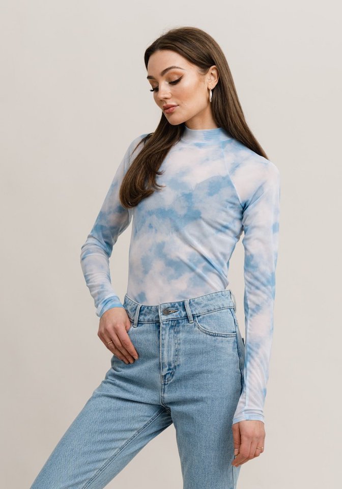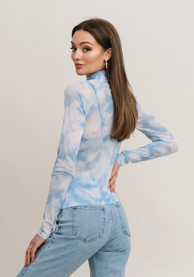 LIGHT BLUE. Mesh top with a dip dye structure. Tight and stretchy fit that feels good to your body. Long raglan sleeves. High neckline with a small attachment around the neck.