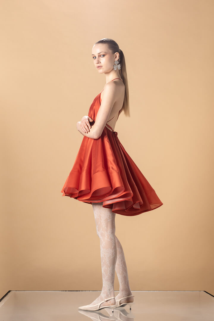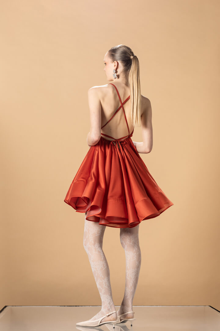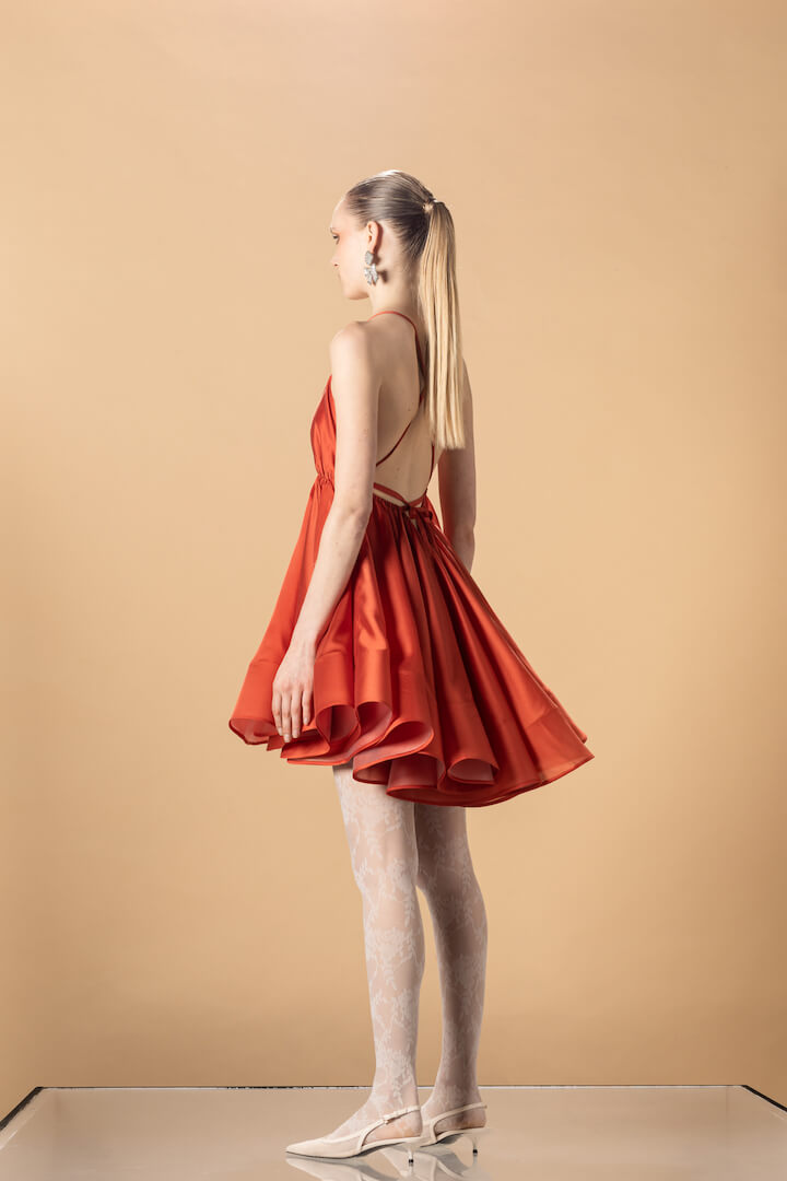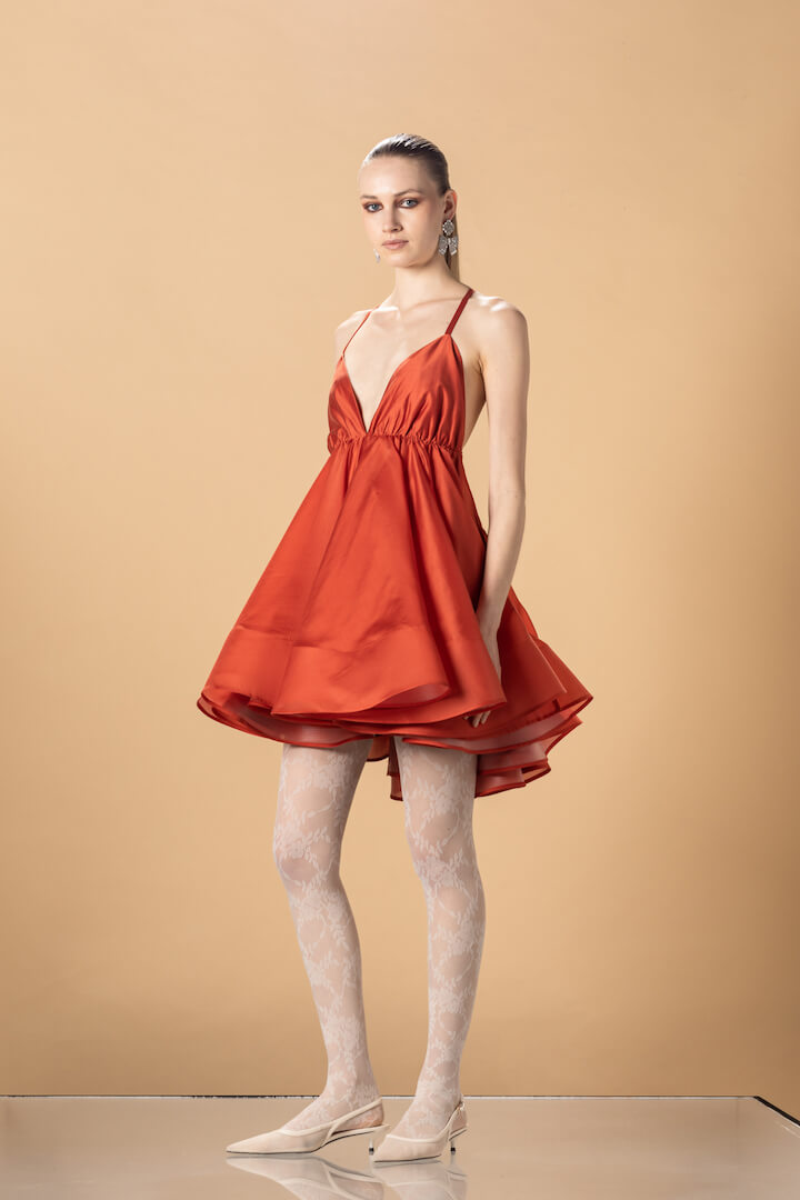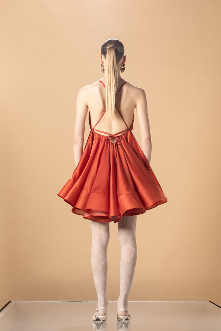 Φόρεμα mini τιραντέ με δίχτυ/γάζα που δημιουργεί κύματα στο τελείωμα, λάστιχο στην μέση, άνοιγμα στο ντεκολτέ και δέσιμο με κορδόνια στην πλάτη.