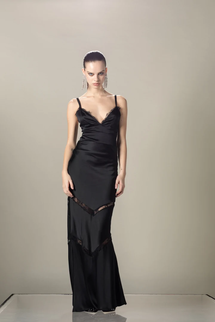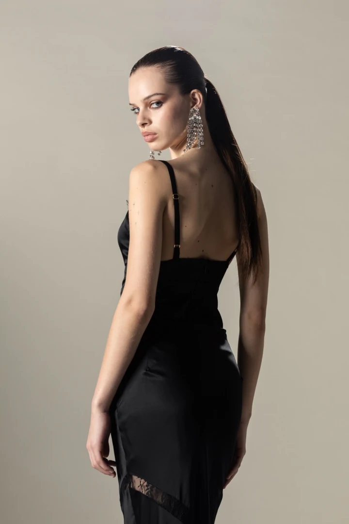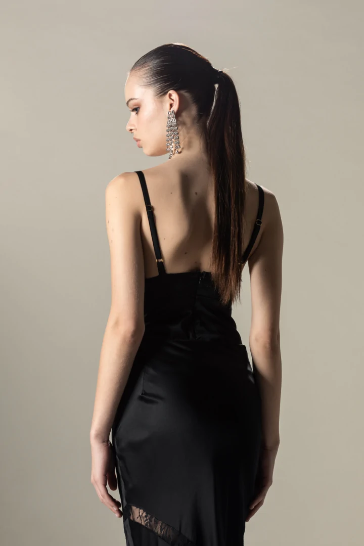 Κορμάκι με τιράντες που αυξομειώνονται, σε στυλ σατέν lingerie με λεπτομέρειες δαντέλας μπροστά και κρυφό φερμουάρ στην πλάτη.