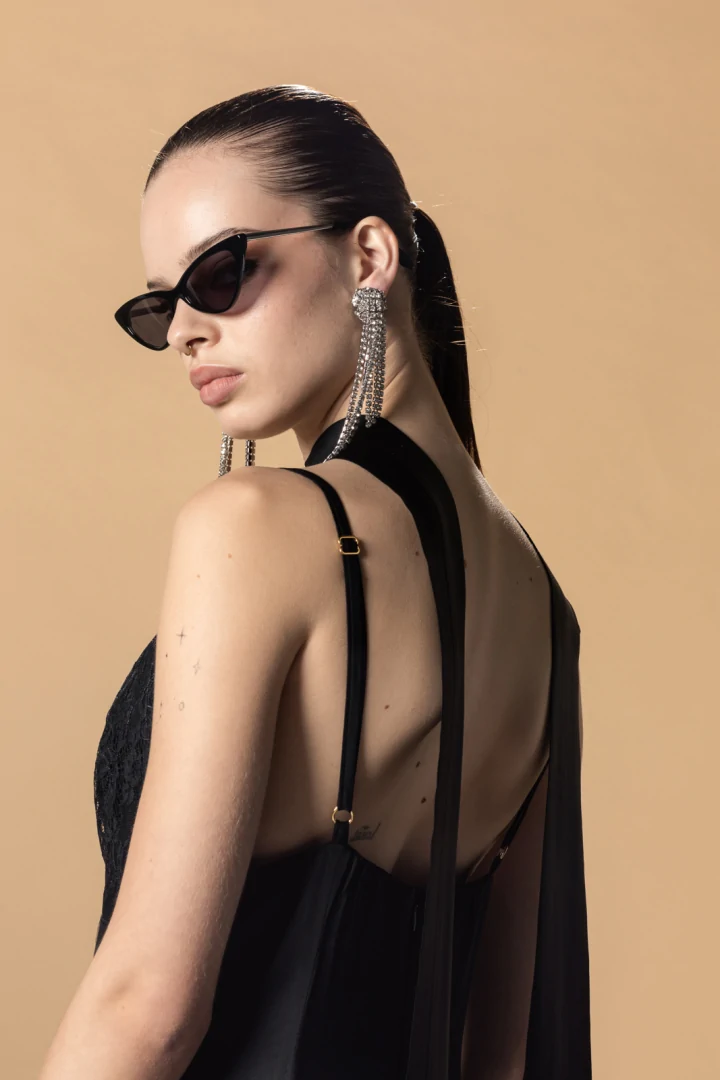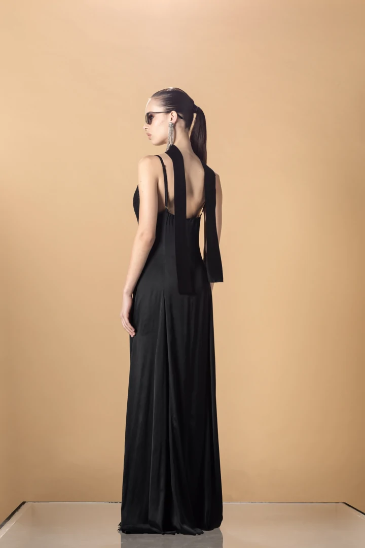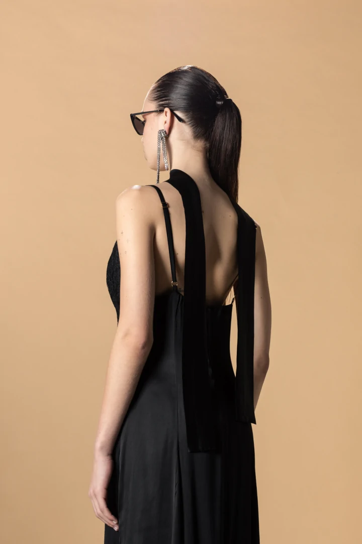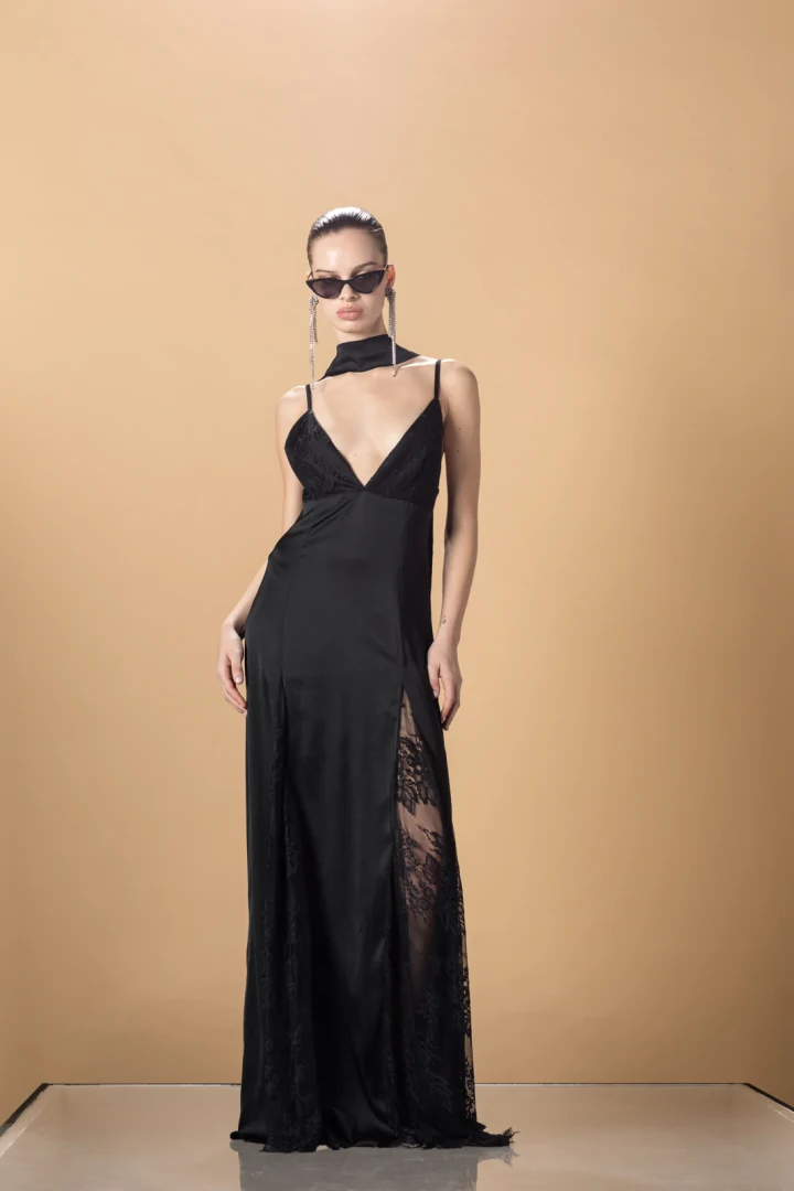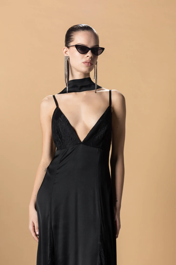 Φόρεμα maxi σατέν σε άλφα γραμμή με λεπτομέρειες δαντέλας στο κάτω μέρος, τιράντες που αυξομειώνονται και κρυφό φερμουάρ στην πλάτη. Συμπεριλαμβάνεται ζωνάκι στο ίδιο ύφασμα.